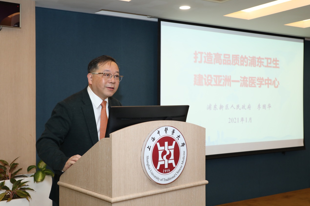 李国华教授以“打造高品质的浦东卫生建设亚洲一流医学中心”为题,立足浦东新区卫生事业,建设亚洲一流医学中心,提出几点建议和思考。他讲到,浦东新区将通过“一体管总、两核集成、四轮驱动”构筑强大的公共卫生堡垒;优先推进肿瘤、儿童医学与口腔三大中心建设全力打造医学高地;通过区域集团化建设与“强腰行动”建立分级诊疗与一体化服务标杆;以细胞和基因治疗为重点塑造科学城生物医药产业名片,以及利用自贸区政策激活市场和促进健康服务业,共同促进浦东新区医疗卫生事业发展。在提问与交流环节,李国华教授回复了公共健康学院张安副教授提出的关于浦东新区“十四五”规划中对发展中医药和文化传承方面的问题,表示新区政府高度重视中医药事业的发展,未来会继续在多方面出台支持中医药事业发展和传承的政策。