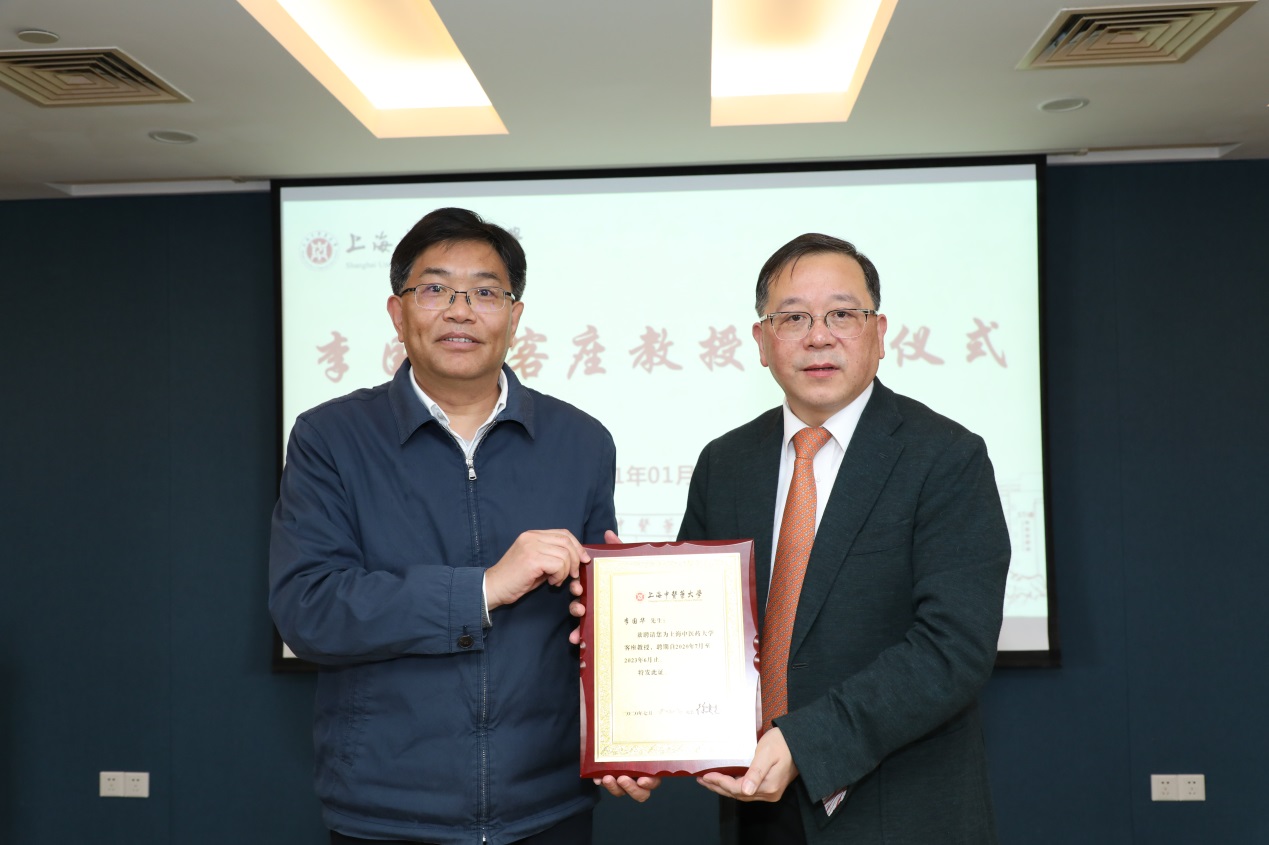 在接下来的客座教授聘任环节,徐建光校长、曹锡康书记分别向李国华教授颁发了客座教授聘任证书及聘任铜牌、校徽并合影。李国华教授对学校此次聘任其作为学校客座教授表示荣幸与感谢,对开云电竞官网下载安卓“不重其全重其优、不重其大重其特、不重其名重其实”的办学理念高度认可。他表示,作为学校的一员,今后将与开云电竞官网下载安卓的领导、同仁一起,为把中医药事业继续发扬光大添砖加瓦。