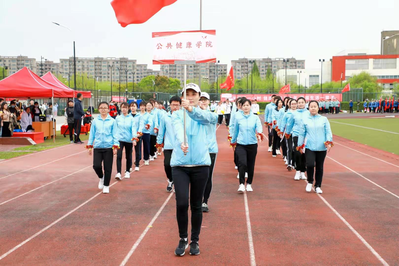 2021年4月14日,我院组织师生参加学校“百岁诞辰筑中国梦阳光体育展岐黄彩”师生运动会。赛前一个月,师生利用业余时间紧密配合,完成八段锦训练。开幕式上,我院32名师生组成的方阵高喊口号“不忘初心担使命,百年风华正青春”,举着院旗,昂首阔步,展示出公共健康学院服务“大健康”的决心与使命。在接下来的八段锦展示中,我院师生将训练成果完美展示,最终获得八段锦团体展示三等奖。