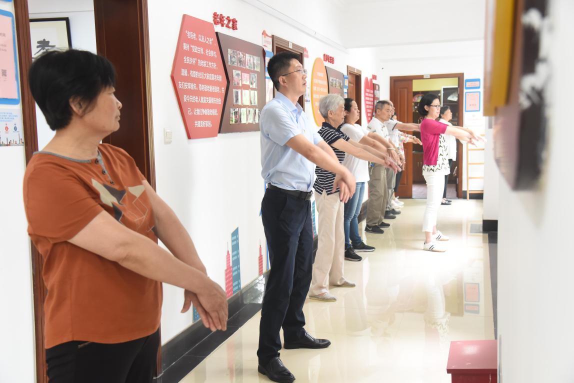八段锦组在走廊里一字排开,带领居民学习八段锦健身功法,让居民认识到锻炼身体的重要性。八段锦作为独立完整的一套健身功法,不需要任何器械,对场地也无特殊要求,可锻炼和放松颈椎、腰椎及肩背等,是适合于老年人群锻炼的适宜功法。经过专业教授,居民们表示学会了八段锦,无论是居家还是户外,都可以锻炼身体。
