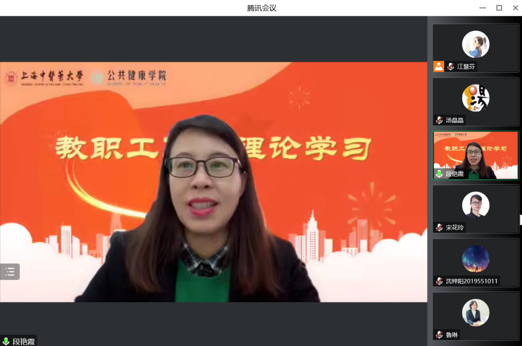 党的二十大是在我国迈上全面建设社会主义现代化国家新征程、向第二个百年奋斗目标进军的关键时刻召开的一次十分重要的大会。为进一步学习宣传贯彻党的二十大精神,把全体师生的思想统一到党的二十大精神上来,把力量凝聚到党的二十大确定的各项任务上来,12月14日下午,公共健康学院党总支组织开展政治理论学习,邀请马克思主义学院副教授、“杏马”理论宣讲团成员鲁琳老师作《“医”心向党明担当 踔厉奋进新时代》主题宣讲,全体教职工、学生党员参与线上党课学习。学习会由党总支书记段艳霞主持。