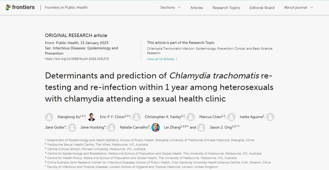 近日,我院徐祥龙特聘青年研究员和澳大利亚莫纳什大学Jason J. Ong, Lei Zhang, Christopher K. Fairley, Eric P.F. Chow等教授在Frontiers in Public Health期刊合作发表题为 “Determinants and prediction of Chlamydia trachomatis re-testing and re-infection within 1 year among heterosexuals with chlamydia attending a sexual health clinic” 的论文。该期刊主要聚焦于公共卫生领域的前沿研究。该期刊也是中国科协科学技术创新部发布的预防医学与卫生学高质量科技外文期刊,JCR分区为Q1,收录于SCI/SCIE中, 影响因子为6.461。