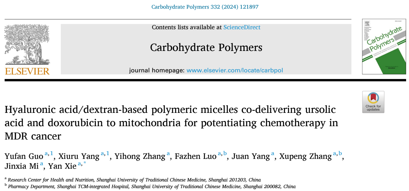 近日,我校公共健康学院谢燕团队在应用化学一区TOP期刊Carbohydrate Polymers发表题为“Hyaluronic acid/dextran-based polymeric micelles co-delivering ursolic acid and doxorubicin to mitochondria for potentiating chemotherapy in MDR cancer”的研究成果,该研究利用透明质酸、葡聚糖为基础载体构建线粒体靶向的聚合物胶束共递送熊果酸与阿霉素,用于耐药乳腺癌治疗,为克服化疗耐药性提供新的策略。