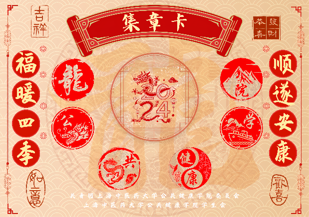 本次游园会所使用的集章纪念卡以及纪念印章是由公共健康学院团委学生会的同学自主设计。此套印章一共8枚,由“龙”字开头,寓意龙年奋进;往后6枚印章依托“公共健康学院”6个字,将阴刻与阳刻相结合。“公”“共”二枚融入了龙与祥云的元素;“健”“康”二枚借鉴中医中“阴阳鱼太极图”的概念;“学”字寓意扬帆起航、砥砺前行,“院”字寓意永不言败、勇攀高峰。居中的方形纪念印章融合了2024龙年春节的喜庆元素,为整套印章增添新年喜气。
