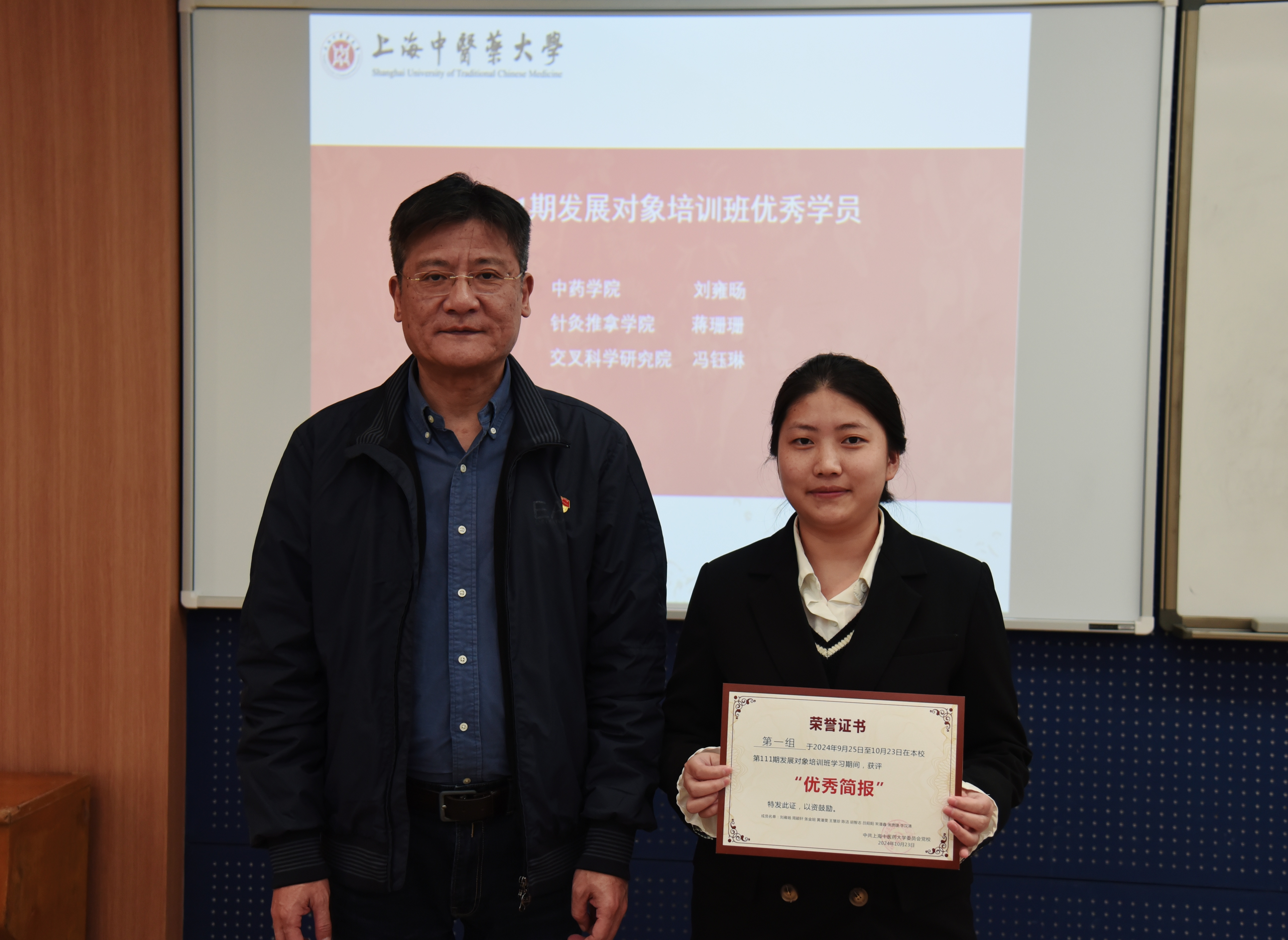 10月23日,由公共健康学院分党校承办的校第111期发展对象培训班结业仪式在6302教室顺利举行。校校党委组织部(统战部、党校)部长周宁慧、公共健康学院党委书记段艳霞、交叉科学研究院党委书记祝建龙、附属龙华医院党委副书记高炬、附属岳阳中西医结合医院党委副书记赵庆、针灸推拿学院党委副书记马杰以及培训班班主任、指导老师和全体学员参加结业仪式。公共健康学院党委副书记干旦峰主持。