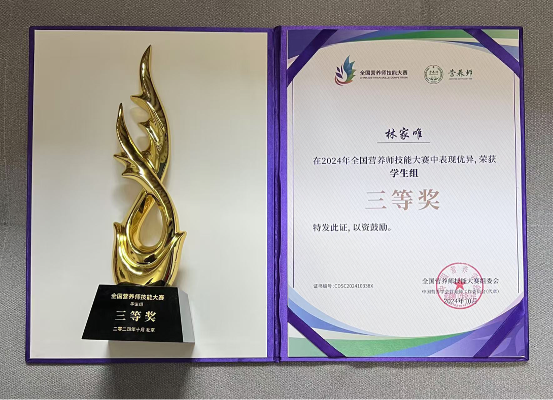 2024年全国营养师技能大赛颁奖典礼于2024年11月1日在河北石家庄举行。我院2023级食品卫生与营养学专业(高本贯通)林家唯同学作为全国营养师技能大赛学生组三等奖获得者参加颁奖典礼。