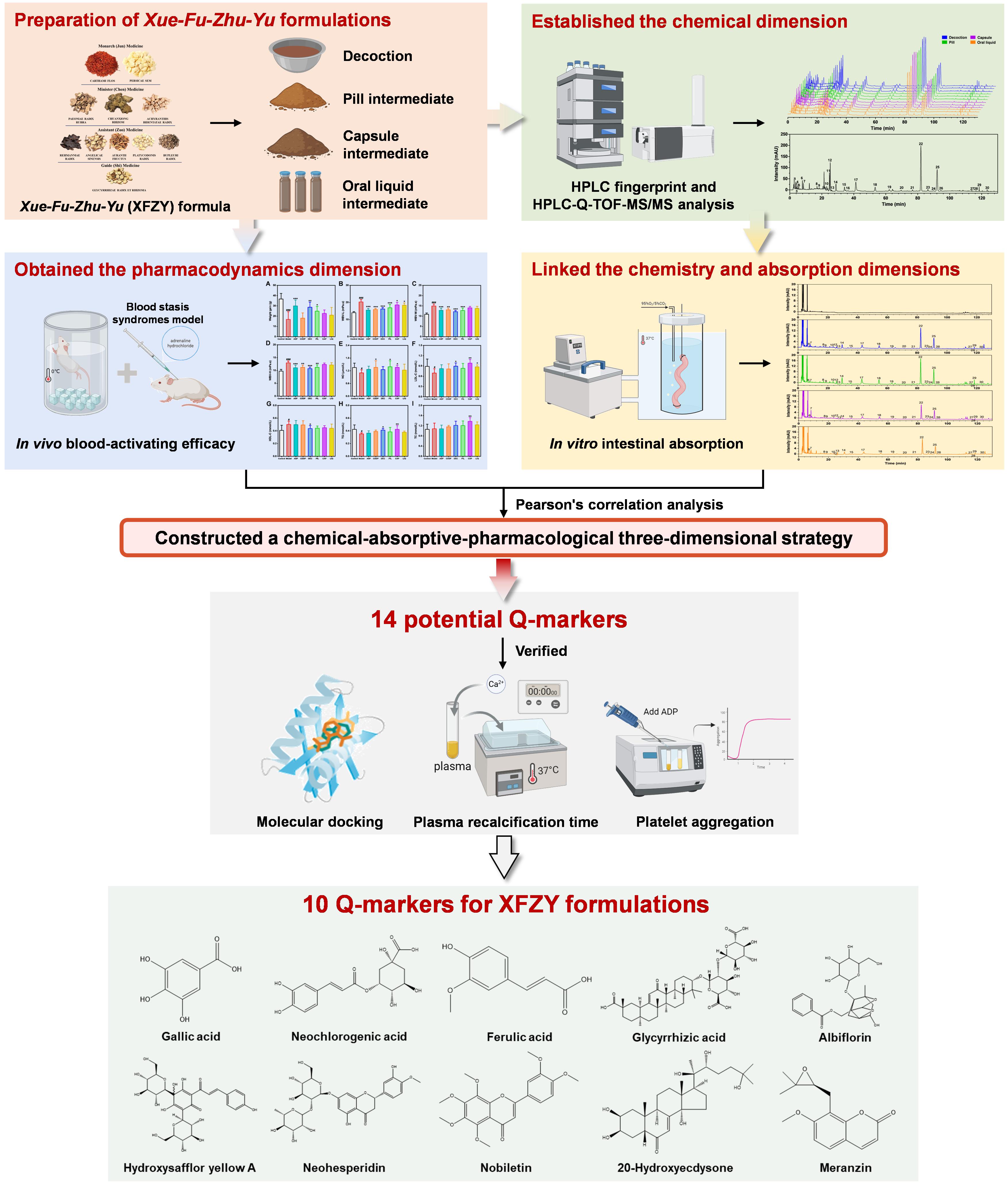 血府逐瘀方是临床广泛应用于心脑血管疾病的经典活血化瘀复方,但该方及制剂的质量控制不完善,产品质量波动较大,影响临床使用。因此,团队构建“谱-吸收-效”关联策略用于探索血府逐瘀制剂的质量标志物。通过HPLC建立血府逐瘀方指纹图谱,确定30个共有峰;经大鼠肠吸收试验,指认可被吸收的23个共有成分及其主要吸收部位(空肠);建立气滞血瘀证大鼠模型,进一步确认与证候学表现、血液流变学、NO及血脂水平等相关联的14个功效成分。经分子对接、抗凝试验验证,得到血府逐瘀制剂的质量标志物为:没食子酸、新绿原酸、羟基红花黄色素A、芍药内酯苷、阿魏酸、β-蜕皮甾酮、新橙皮苷、橙皮内酯、甘草酸和川陈皮素。