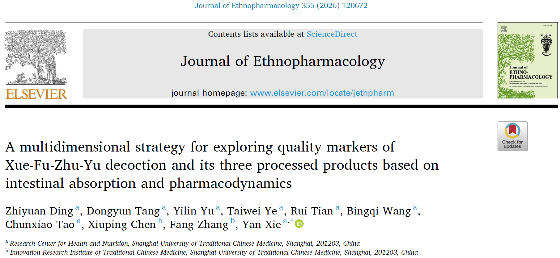 近日,我院健康营养研究室谢燕团队在Journal of Ethnopharmacology(Q1 TOP 5)发表题为“A multidimensional strategy for exploring quality markers of Xue-Fu-Zhu-Yu decoction and its three processed products based on intestinal absorption and pharmacodynamics”的研究成果,该研究将化学分析、肠吸收和药效学三个维度相关联,探索血府逐瘀制剂的质量标志物,为丰富和完善经典复方的质量控制提供科学基础。