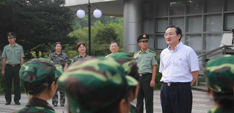 张智强、徐建光等详细询问了目前我校军训开展的具体情况,了解军训期间参训新生的思想动态、生活起居和军事训练等情况,并代表学校党政领导对军训团作出的细致安排表示肯定,对各位教官、教导员和指导员的辛勤工作表示感谢。在与全体学生分享自己30年前参加军训的经历时,徐建光强调,军训是大学生活不可或缺的一课,他要求全体参训学生应当严格要求自己,发扬不怕苦、不怕累的精神,在磨砺意志品质的同时,进一步提高自身的综合素质,向教官们学习,向解放军学习,保持高昂的训练作风,圆满完成此次新生军训任务。