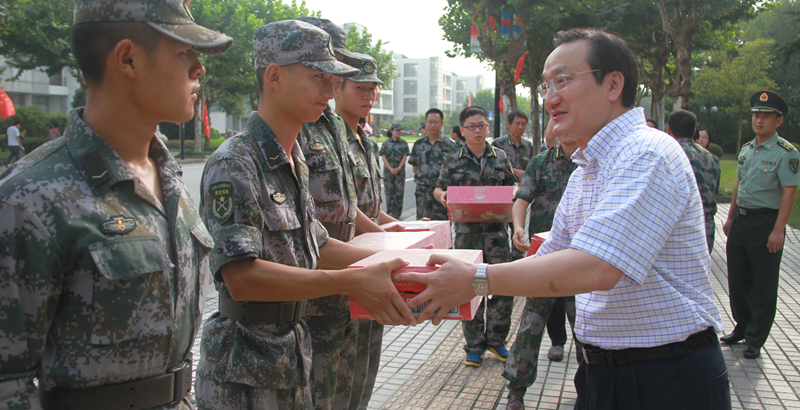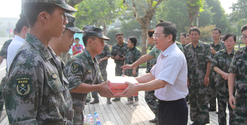 9月5日上午,校党委书记张智强、校长徐建光、校党委副书记朱惠蓉等校领导携军训团干部慰问正在紧张训练的师生官兵,并为各连排送上慰问品。