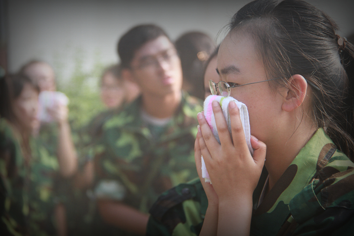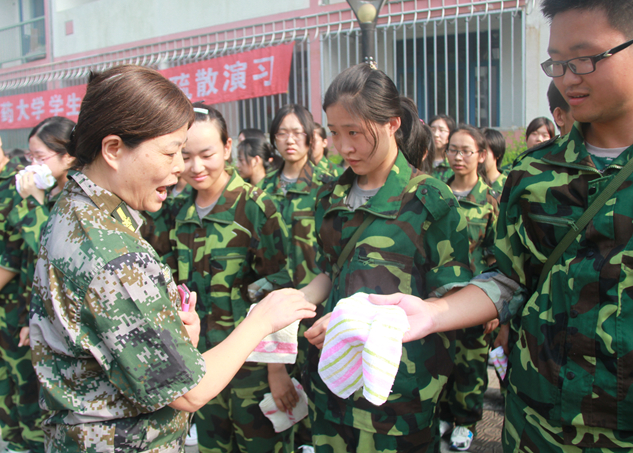 3、校党委朱惠蓉书记在演习结束后指导同学如何使用湿毛巾捂鼻逃生