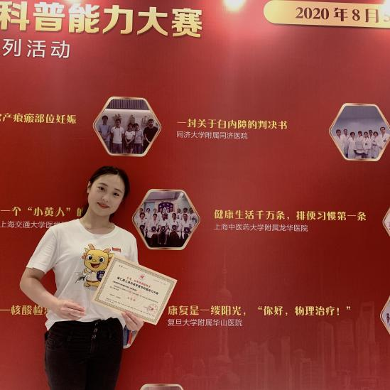 “硬核”科普已然走向全民时代,借助移动互联网知识传播的便捷性和广泛性,各种科普形式呈现在大众眼前。在科室老师们的指导及大力支持下,她参与日常“龙华肛肠”科室公众号的运营维护,获得第七届上海市青年医学科普能力大赛团队二等奖。同时撰写科普文章,普及肛肠知识,传播健康理念。作为一名新时代的医学生,不忘紧跟潮流,让真科普进入百姓生活。