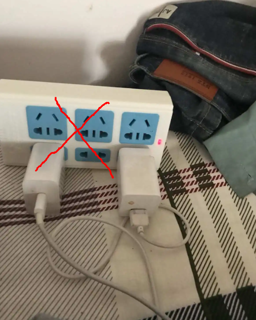 部分同学为了方便使用,会将插座放在床上连接电器,甚至会躺在床上边充电边玩手机、看电脑。一旦电线有破损或者插座板短路,极易引发触电事故和火灾。