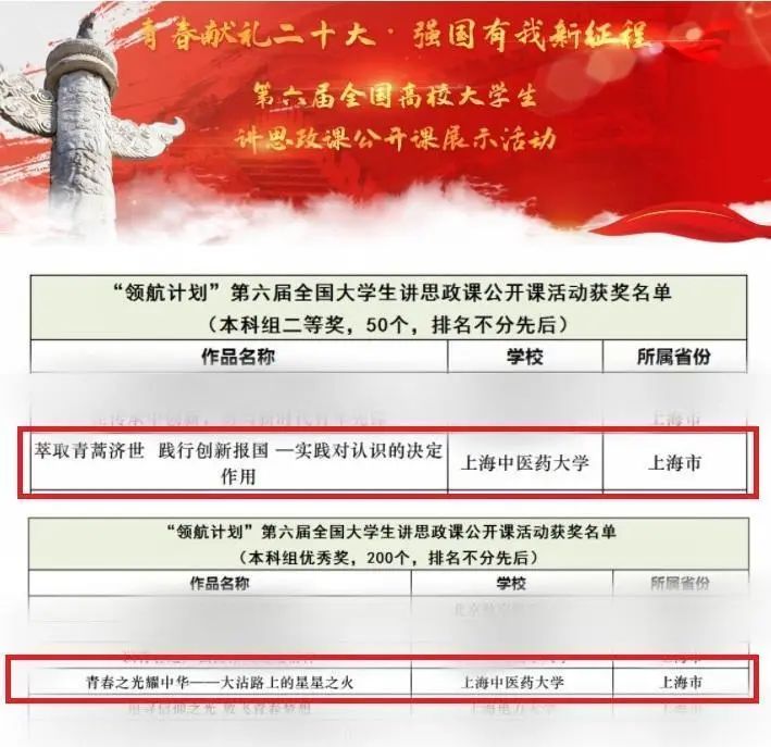 近日,由教育部高校思政课教学指导委员会主办的“青春献礼二十大·强国有我新征程”——第六届全国高校大学生讲思政课公开课展示活动和“我心中的思政课”——第六届全国高校大学生微电影展示活动获奖名单揭晓。公开课“萃取青蒿济世,践行创新报国——实践对认识的决定作用”获本科组二等奖;公开课“青春之光耀中华——大沽路上的星星之火”获本科组优秀奖;微电影《镜》获优秀奖。
