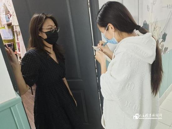 在宛平学生宿舍园区“枳实苑”,岳阳临床医学院的博士生卢进和闾智颖暂时放下手中的实验,第一时间加入志愿者队伍,组织各楼层学生有序参加核酸检测、落实早健康报、晚点名。