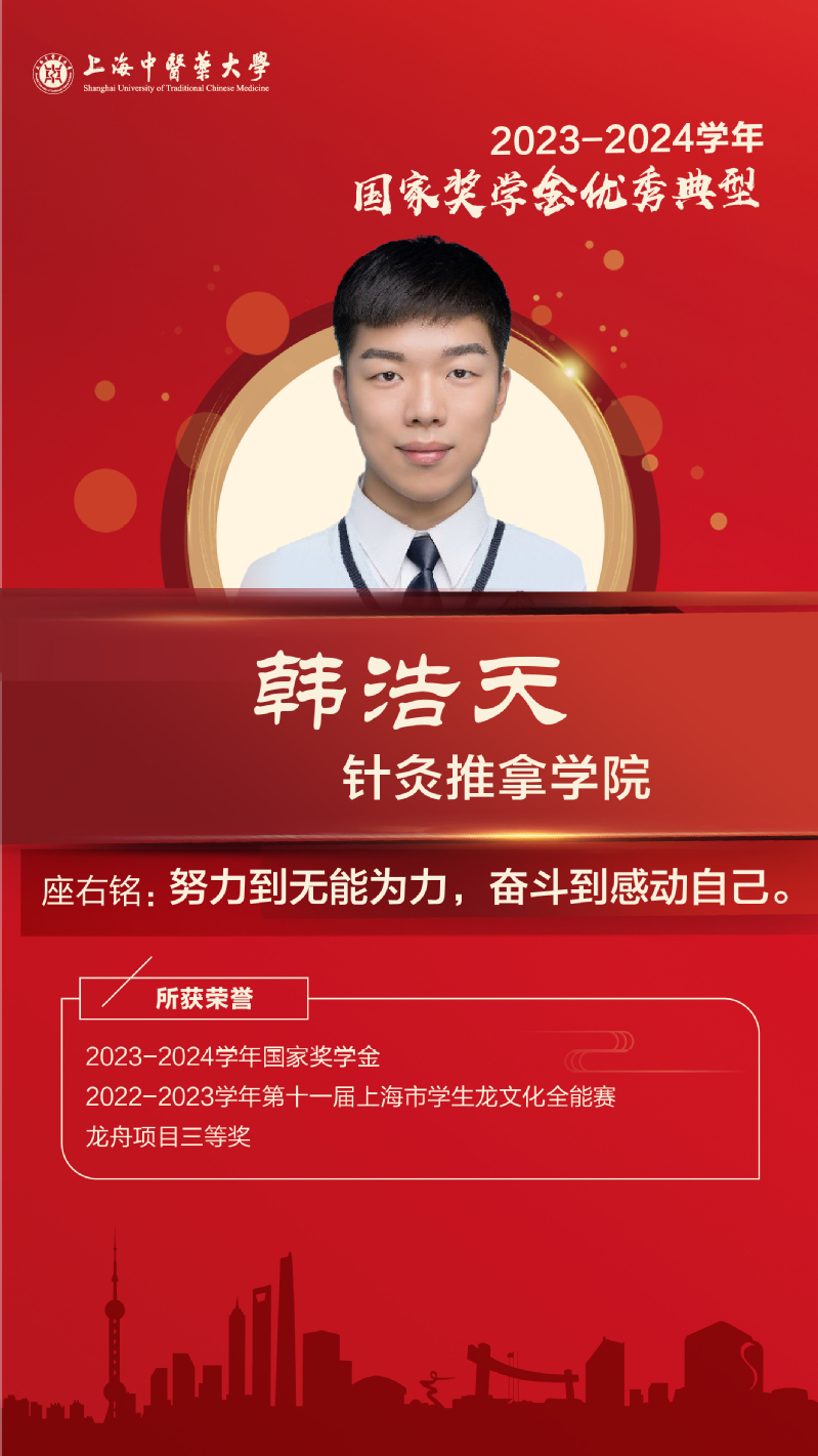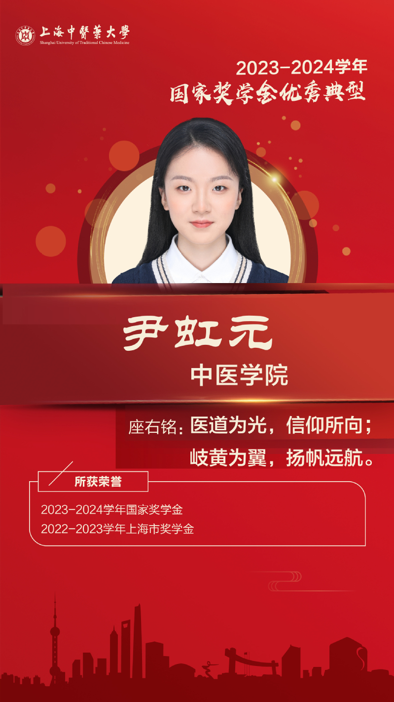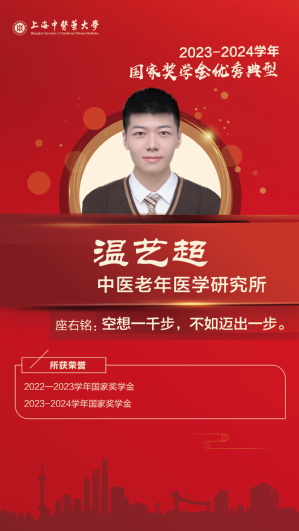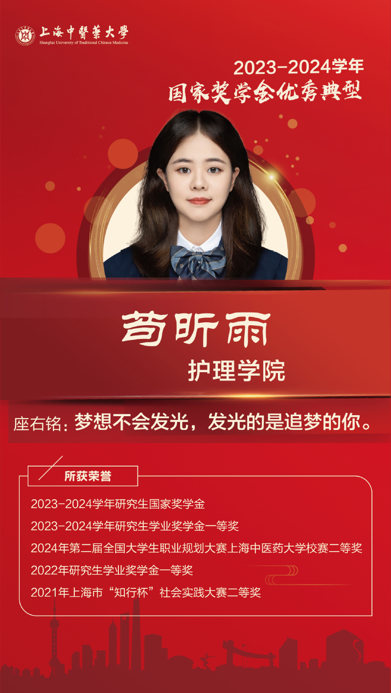 入校以来参与多个科研项目,具有较好的实验技能和文献研究能力;积极参加创新创业大赛并多次获得奖项。在学生工作与志愿服务中,她以实际行动诠释中医药学子的责任感与使命感,在多个岗位担任学生干部,获评优秀学生标兵和优秀学生干部等;累计志愿服务时长达400小时。未来,她将砥砺奋进,以更加坚定的信念迎接新时代的挑战,为中医药事业的发展贡献青春力量。