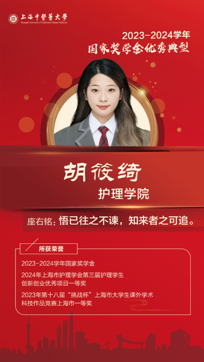 连续三年综测成绩排名第一,获得三次校一等奖学金。在实习期间,掌握护理常规技术,善于观察临床问题并乐于思考。曾获得2024年上海市护理学会第三届护理学生创新创业优秀项目一等奖、2023年第十八届“挑战杯”上海市大学生课外学术科技作品竞赛上海市一等奖等奖项。在过去的三年里,共担任过4项学生干部职务。曾任护理学院学术创新部负责人、层长、班级学习委员、团支书,在任职期间,全心全意为同学们服务。从懵懂到历练,从茫然到成熟,她将在自我成长的路上不断前行着。