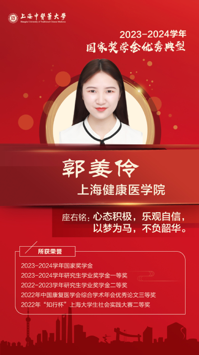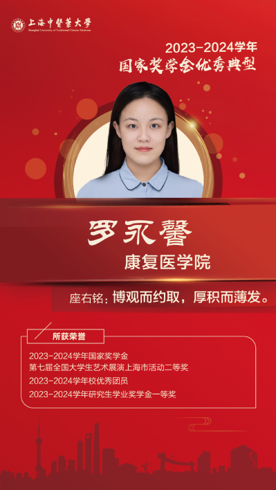 她在科研学习中严谨求实、勤奋钻研,积极探索镜像视觉反馈范式的临床运用,初步成果在中华医学会第二十三次全国物理医学与康复学学术会议上作口头报告,在导师路建伟教授的指导下,与课题组成员共同参与第18届国际物理与康复医学大会(ISPRM 2024, Sydney),完成了两项科研成果的交流报告工作;业余时间积极参与学校民乐团排练演出,荣获第七届全国大学生艺术展上海市活动二等奖,并参加中国-奥地利大学生音乐欣赏交流会等活动,积极宣传推广中医药和中国传统音乐文化;并多次参与志愿服务,尽力为他人提供帮助,协助南航乘务组成功处置急病旅客,获专信表扬,践行学以致用、回报社会、服务人民的责任与使命。