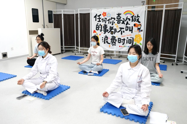 模拟手术室秒变“瑜伽”教室,在心肺复苏训练的小蓝垫上,同学们跟着辅导员用AI生成的舒缓音乐与引导语,体验了瑜伽休息术。“虽然只有5分钟,但仿佛给心灵做了一场SPA,这个方法非常好,适合平常快速修复自我能量”,完成体验后,同学们如是说。
