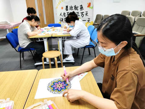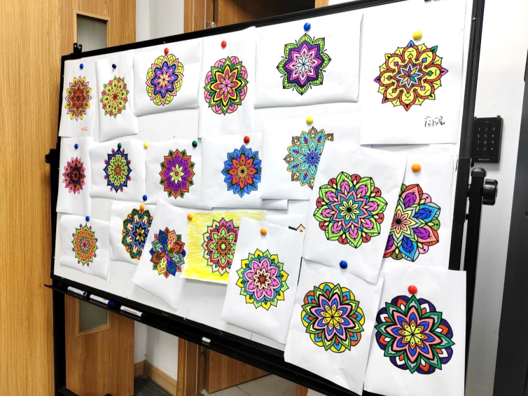 同学们自由选择黑白线稿,自由发挥、创意上色,在“画室”中构图,创作个性化的斑斓世界。96%的同学在活动中感受到不同程度的放松,这站也成为同学们最喜欢的站点,在轻松中感受色彩带来的美好与治愈。