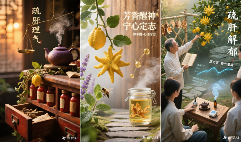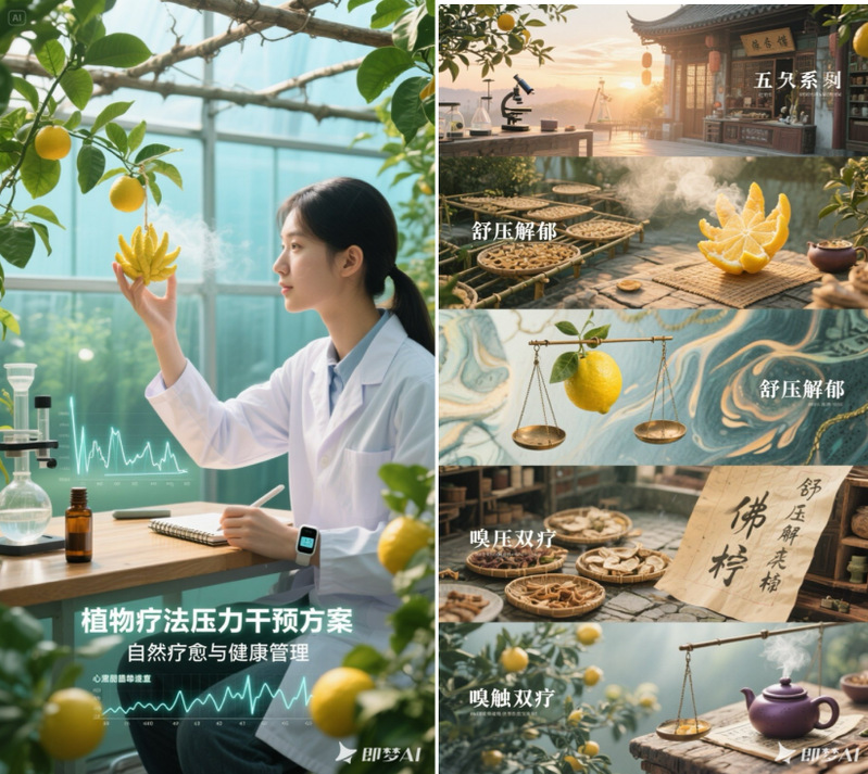 本系列作品以佛手柑为核心意象,结合预防医学生物-心理-社会健康模式与中医药疏肝解郁理念,展现自然景观对心理减压的疗愈作用。五组场景分别构建了从实验室到生态园的多维疗愈场域:在预防医学实验室,皮质醇监测与佛手柑香雾形成生物反馈闭环;中医生态园中,太冲穴诊断与十二经络投影诠释了香气通络的古老智慧;暮色药铺通过微距揭示植物结晶的药用美学;精油工坊则演绎了从腺体特写到分子流星的疗愈链;最终以五感疗愈整合视觉、触觉、嗅觉等多元干预策略,完整呈现了传统本草与现代科技对话下的心理健康解决方案。