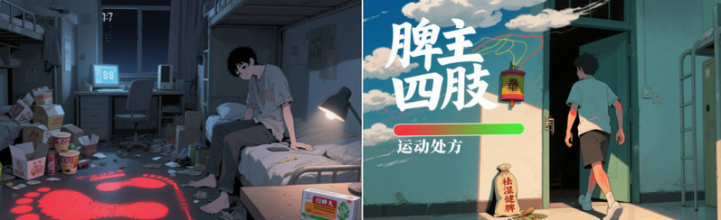 (1)MidJourney和豆包:生成4张AI绘画,通过关键词“大学生、熬夜、脾主四肢、五行调和、体重指数可视化”调整画面细节。