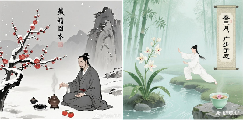 (1)DeepSeek:生成高精度关键词(如“雪中红梅+禅意”“竹林+太极”),整合中医典籍术语。