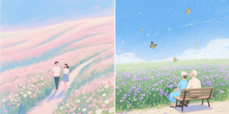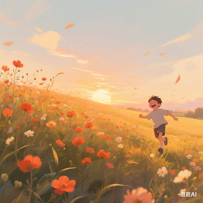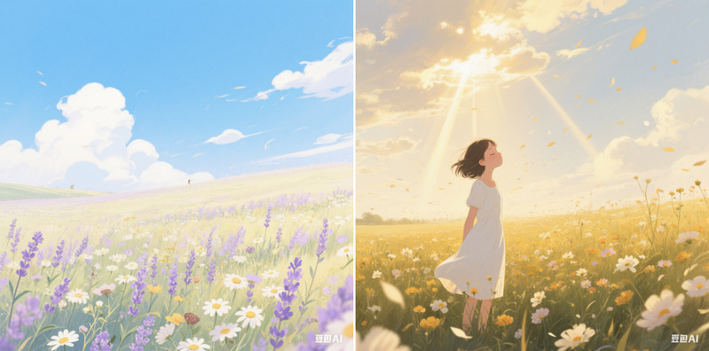 (1)豆包:生成5张AI绘画,通过关键词“花田”“心理减压”“治愈”“宁静”“微风”“天空”“舒缓”调整画面细节。