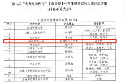 届“我为资助代言”上海高校十佳学生资助宣传大使评选活动顺利举行。我校护理学院学生麦尔哈巴·艾散获十佳学生资助宣传大使荣誉称号。