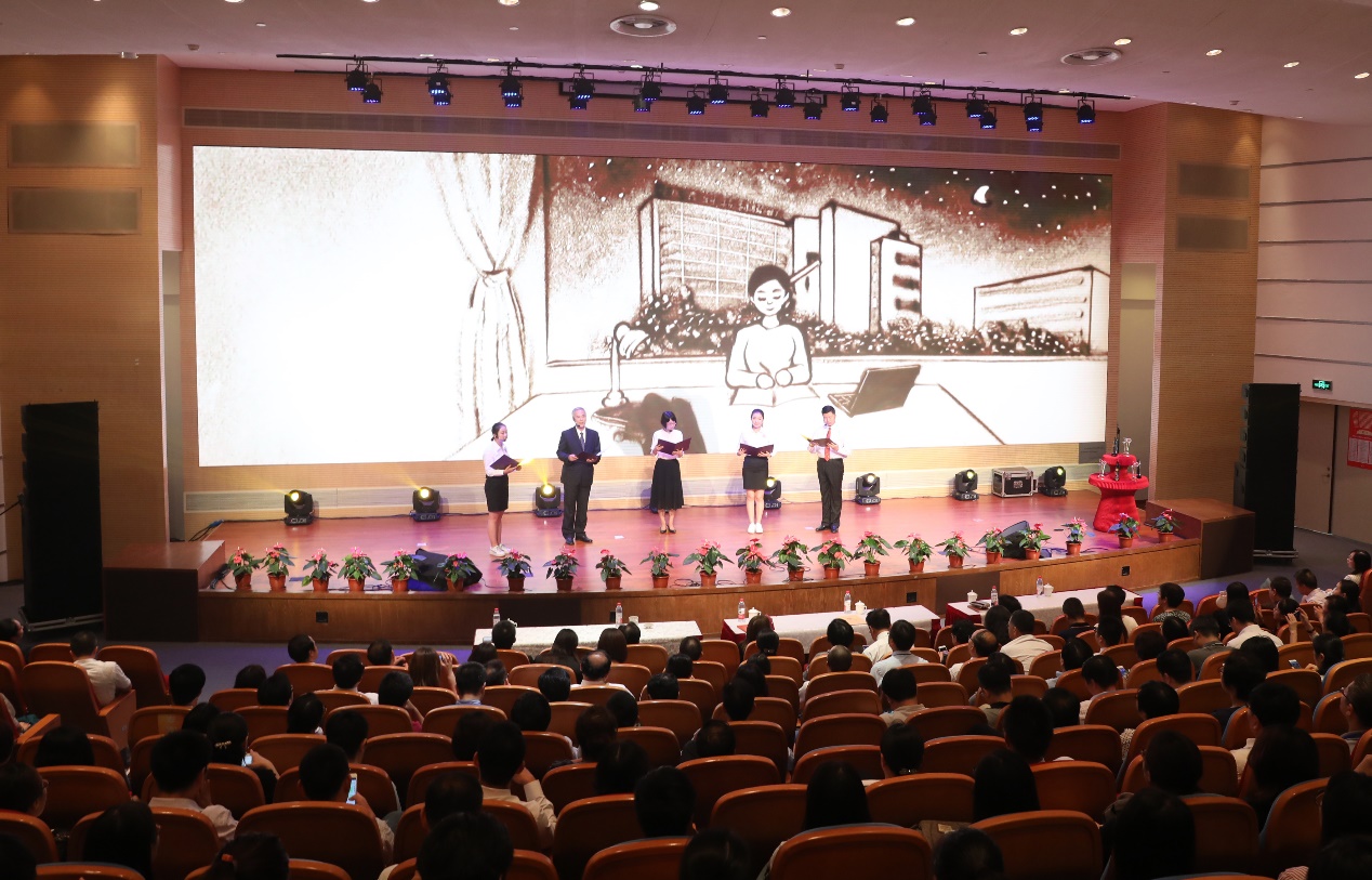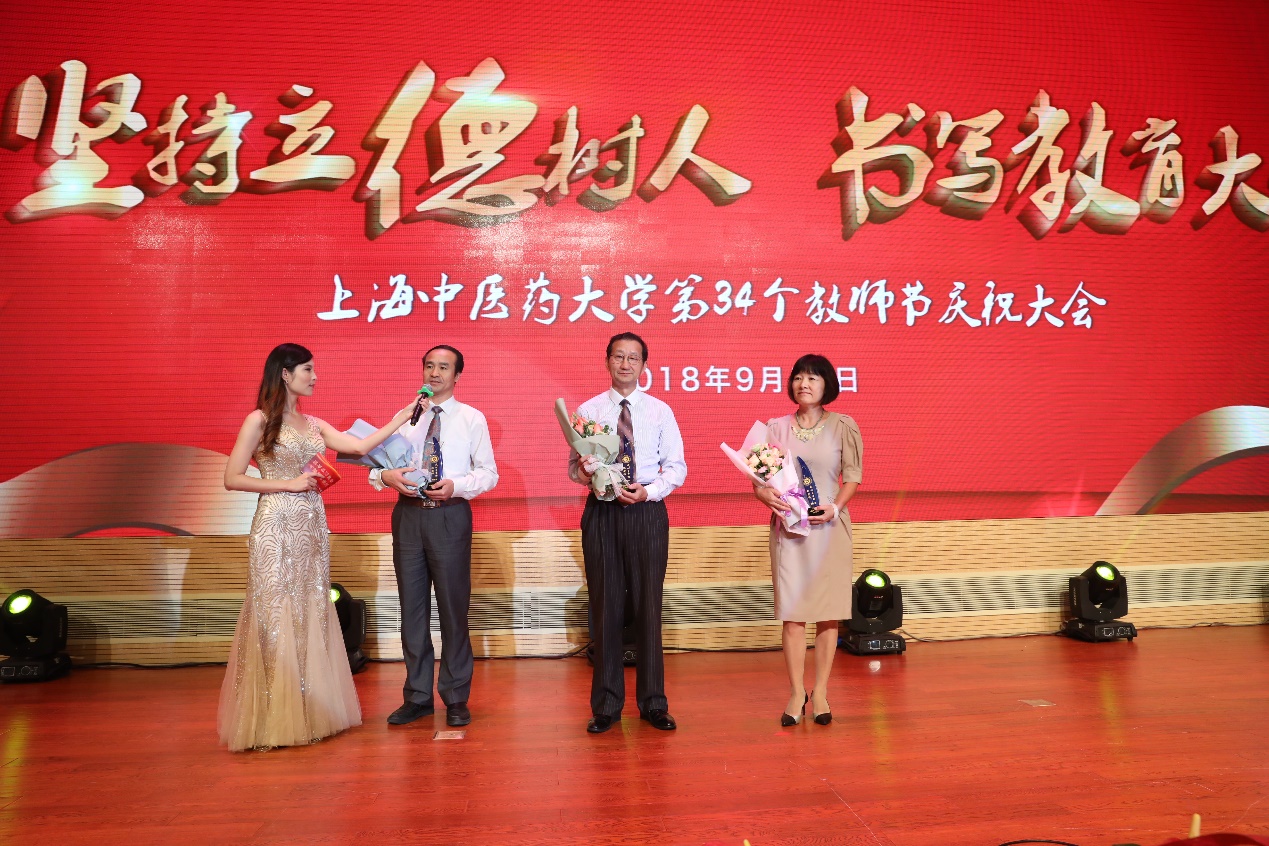 学生小组演唱《最美的你》拉开大会序幕,美妙的歌声表达出杏林学子对教师的崇敬和喜爱之情。在“教育工作三十年”教职工颁奖环节,视频“时间”引领与会人员通过4名不同岗位三十年教龄教职工代表的日常工作感悟他们三十年如一日勤恳敬业、甘为人梯、乐于奉献的精神,从12名三十年教龄教职工的新旧照片对比中领略他们与学校同舟共济、共同成长的情怀,并从他们的笑脸照中体会他们对学校发展的殷切期望。曹锡康为这12名教职工颁发纪念奖杯。师生情景朗诵《杏林师生情》由全国优秀教师、上海市教书育人楷模、我校基础医学院教授张黎声,康复医学院副院长刘晓丹和3名学生共同演绎,展现了我校师生之间的情感交流,以及老师和学生似亲人、如朋友的深厚情谊。