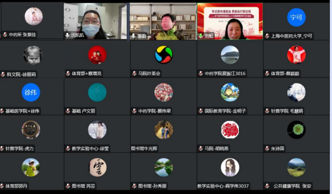 12月21日下午,“牢记使命强担当 勇毅前行新征程——深入学习宣传贯彻党的二十大精神”专题系列第二场教师学习交流会暨第34期“杏林有约”教师午间沙龙于线上举办。全国模范教师、上海市教学名师、我校终身教授方肇勤围绕党的二十大报告关于教育工作的关键词,以“立德树人忆初心 培根铸魂育新人”为主题,与参会教师开展交流座谈。宣传部(党委教师工作部)副部长刘虹主持会议。教师党支部书记、青年教师班主任等70余位教师在线参与。