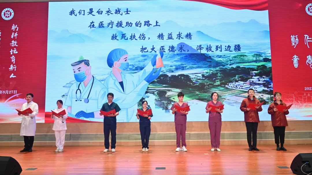 全国教书育人楷模、学校科技人文研究院院长刘红宁教授深情寄语广大教师:大力弘扬教育家精神,奋当为党育人、为国育才的大先生。第五届“上海市教育功臣”获得者、曙光医院院长房敏教授带领新进教师代表,完成庄严而神圣的教师宣誓仪式。