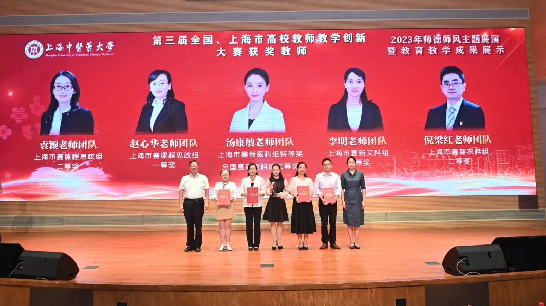 展示会上,学校对荣获2022年国家级教学成果奖一等奖的陈凯先院士团队,二等奖的陈红专教授、王峥涛教授团队进行了表彰。
