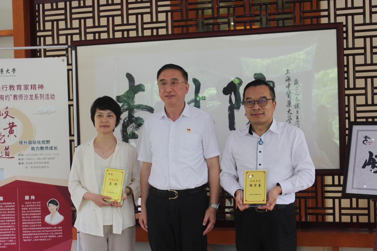 522日中午,第46期“岐黄论道·杏林有约”教师沙龙在学校行政中心一楼杏林院举行。活动围绕“提升国际化视野,助力教师成长”主题,邀请两位海外留学归国教师代表——我校首席教授、中药学院名誉院长、国家特聘专家徐宏喜,以及上海市“东方学者”特聘专家、市政协常委、校科技处副处长屈祎担任嘉宾,并为他们颁发“阳光导师”聘书。活动由宣传部(党委教师工作部)、组织部(统战部)、科技处、中药学院联合举办。校党委副书记沈辉,相关职能部门负责人、中青年教师、研究生代表等50余人现场参与,活动由宣传部(党委教师工作部)副部长刘虹主持。