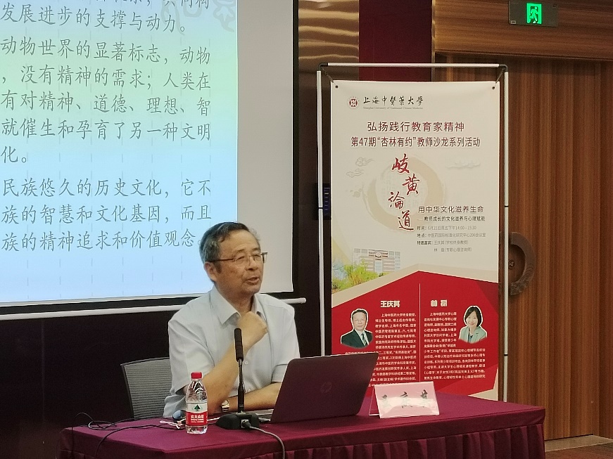 王庆其围绕“用中华文化滋养生命”主题,结合自己近60年的从医经历,从文化的内涵与作用、中医药文化的定义、“和”思想在中医学中的重要性以及中医人学习传统文化的意义等方面深入阐述。他指出,教育分为生存教育与文化教育,前者是学习治病救人的本领,而后者是明白生存的目的和意义,文化教育应该从中华传统文化中吸取精华、滋养生命。他认为,健康的本质是“气血、精神、天人的和谐”,并就中医学养生提出了六点原则和方法,包括顺时养生、精神养生、饮食养生、运动养生、房室养生和道德养生,为教师们提供了全面的健康指导。