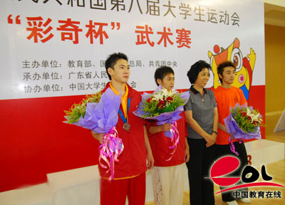 图为教育部副部长陈小娅女士为我校武术队员林睿智颁奖