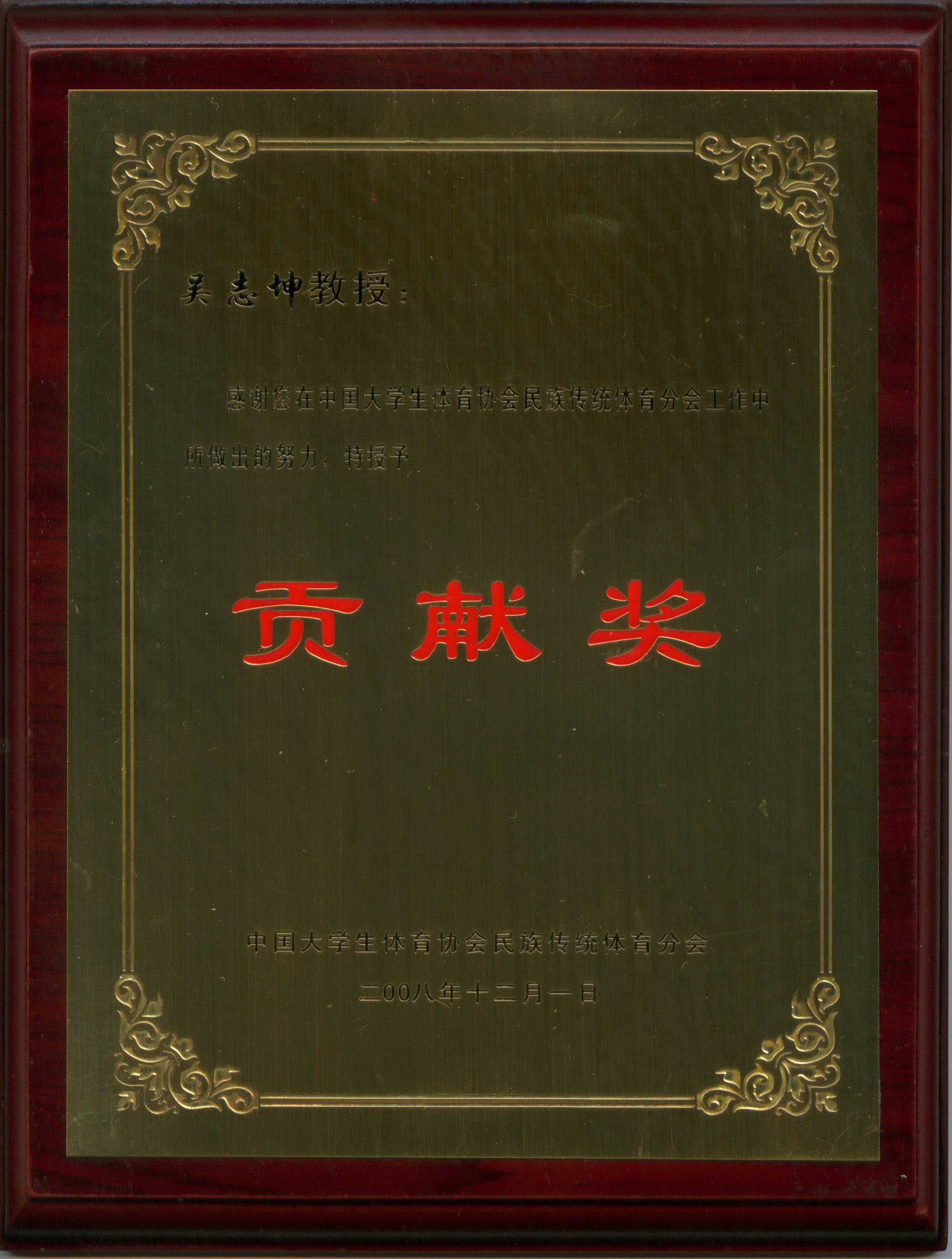 2008年11月30日至12月2日在北京中医药大学召开的中国大学生体育协会民族传统体育分会第四届代表大会上,我部教师吴志坤被授予民族传统体育工作贡献奖,以此鼓励五年来该同志在中国大学生体育协会民族传统体育分会工作中所做出的贡献。
