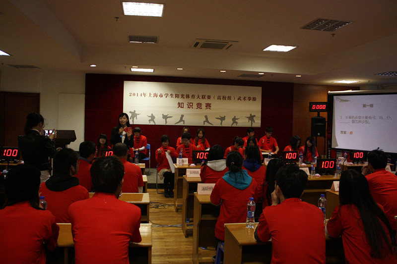 2014年11月14日,上海市学生阳光体育大联赛(高校组)武术拳操知识竞赛在我校举行,共有20所高校40名选手出席了本次知识竞赛。本次竞赛涵盖武术文化、武术基本理论知识、武德知识、武术历史人物知识等。比赛共分为三个环节:必答题(屏幕选题、题板答题)和抢答题。整场竞赛气氛热烈,紧张有序,抢答题环节惊险刺激,参赛选手们凭借出色的表现,博得了观众们一阵阵的掌声,将比赛推向了高潮。在本次比赛中选手们沉着冷静,积极作答,更考验了他们的反应速度与胆量,经过三场激烈的角逐,最终开云电竞官网下载安卓以206分的总成绩名列第一,上海师范大学、上海医疗高等专科学校分别以201分、196分名列第二、第三名。