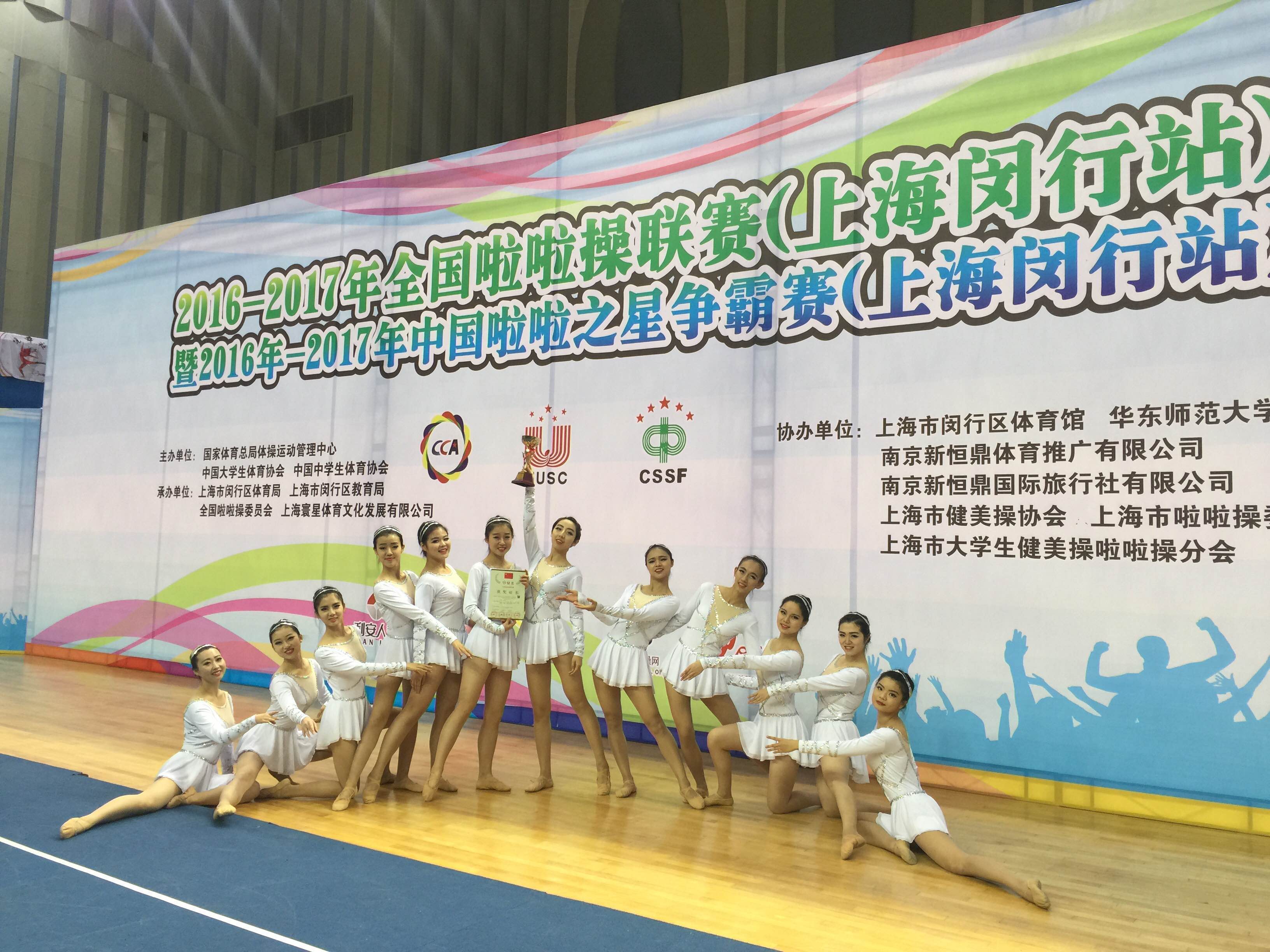 2016.11.26,上海市阳光体育大联赛高校组团体健身操比赛(本科组)12人自编动作团体一等奖,最佳组织奖;