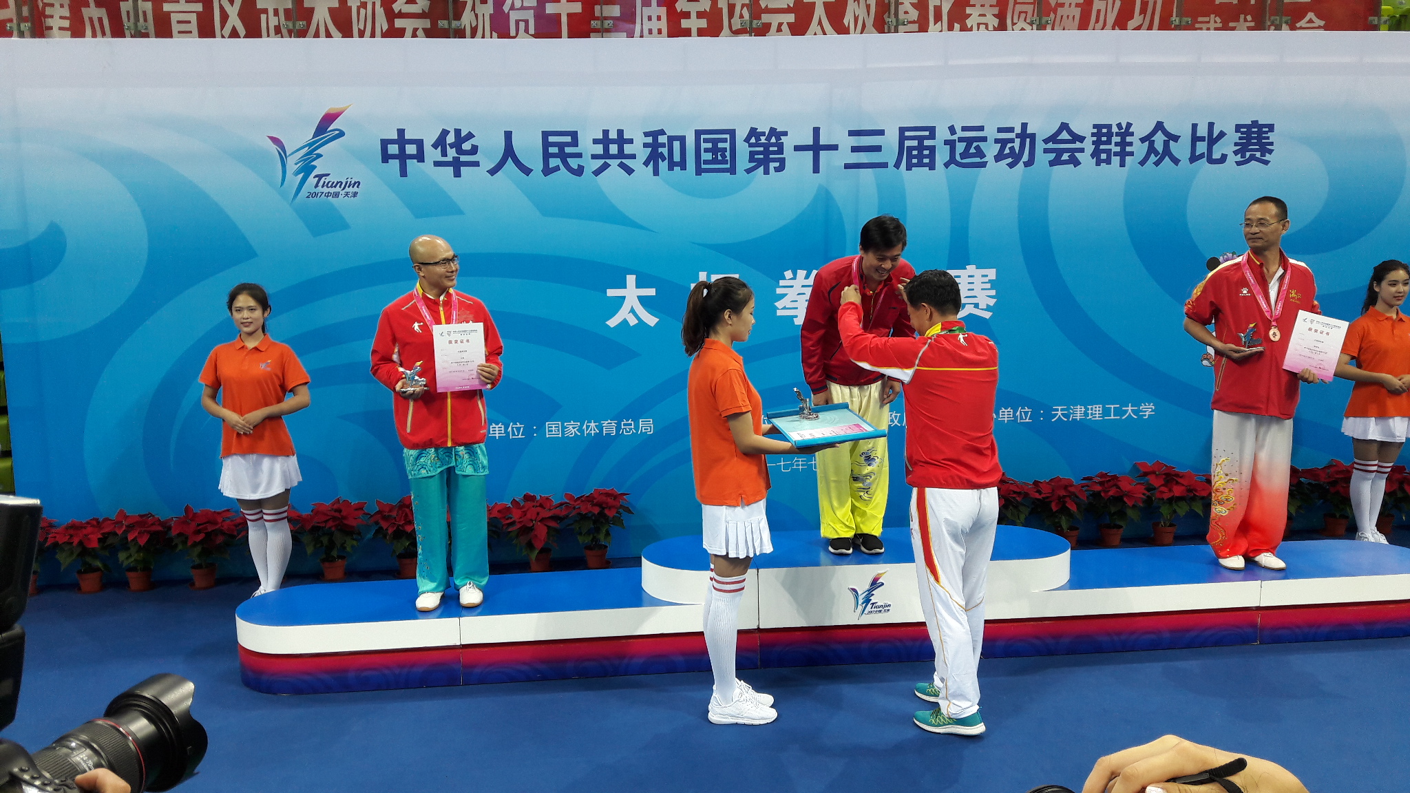 7月7日晚,我校体育教师冯金瑞在全运会群众比赛男子组规定孙式太极拳73式决赛中,以9.34分的成绩排名首位,收获金牌。