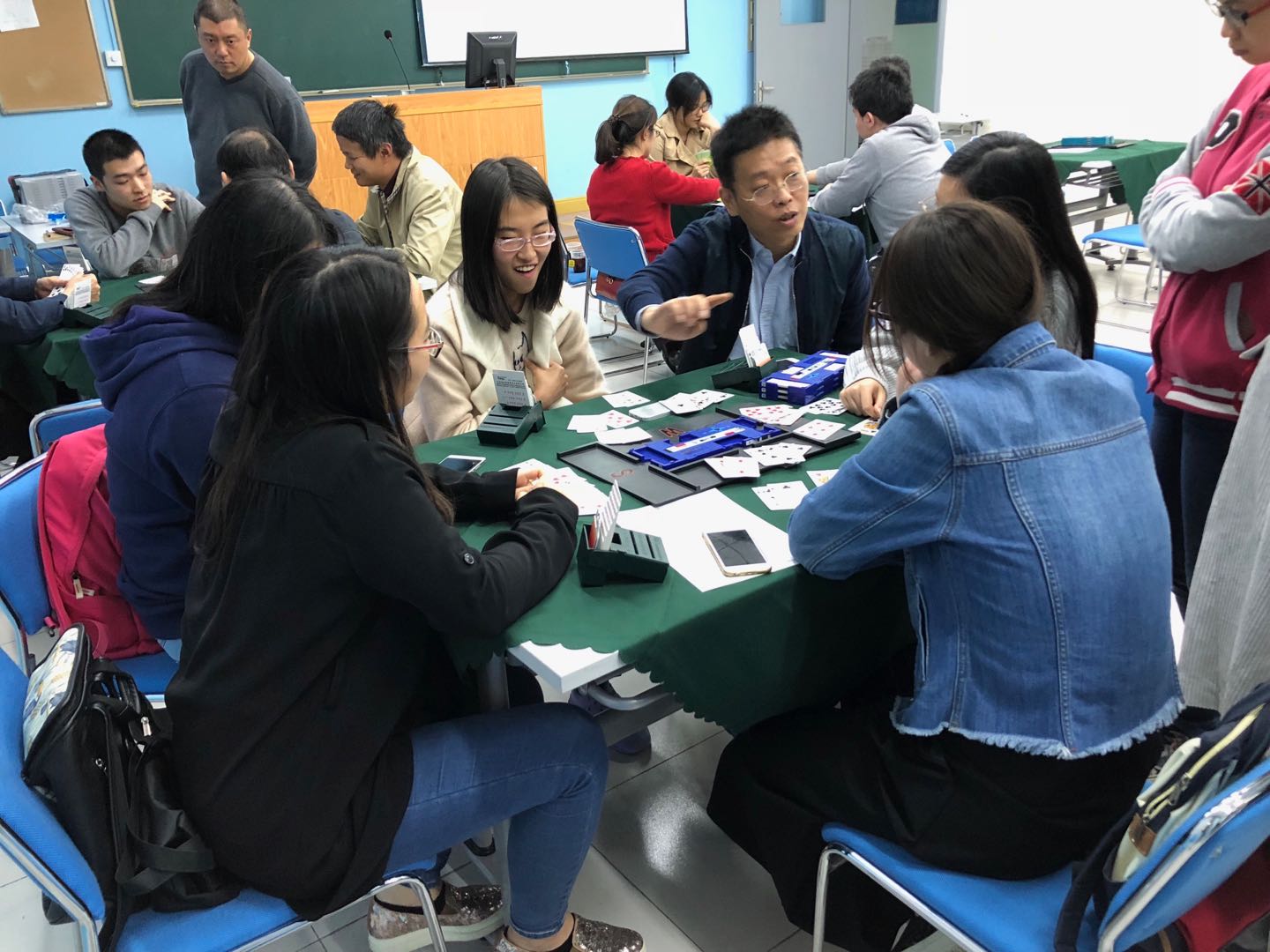 在热烈的掌声中,刘晓平大师的授课暂告一段落;接着是自由打牌时间,大师巡视并及时就选手们提出的疑惑进行详尽的解答。打牌时选手们纷纷向大师提问,场面气氛热烈。