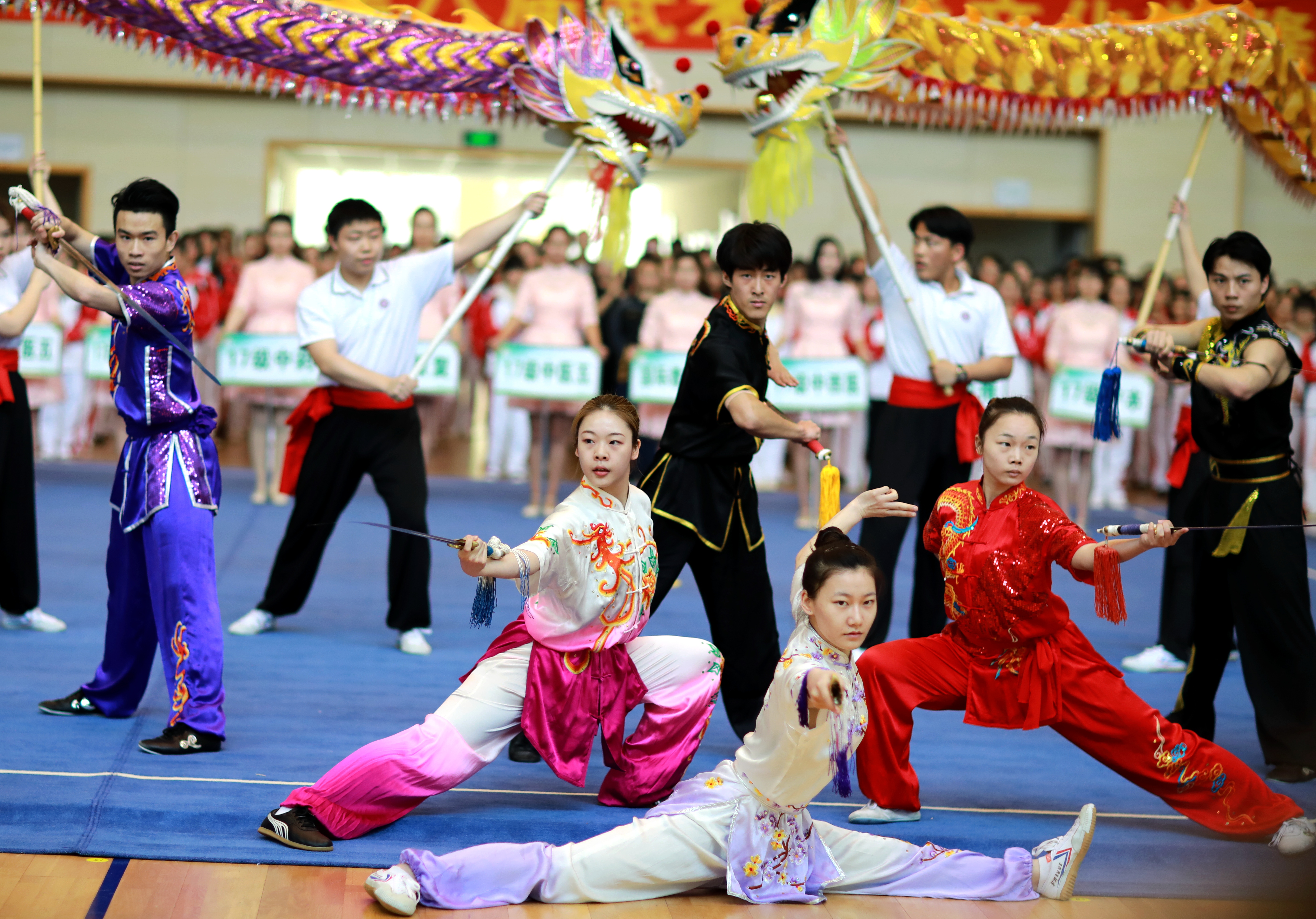 其后,教练员、运动员代表分别进行宣誓,校领导共同宣布运动会开幕。校舞龙队、武术拳操队、健美操队、武术队及教职工们为本届运动会开幕式带来精彩表演。比赛期间,各参赛队伍组织有序、团结协作,展现出我校学生良好的精神风貌和武术风采。