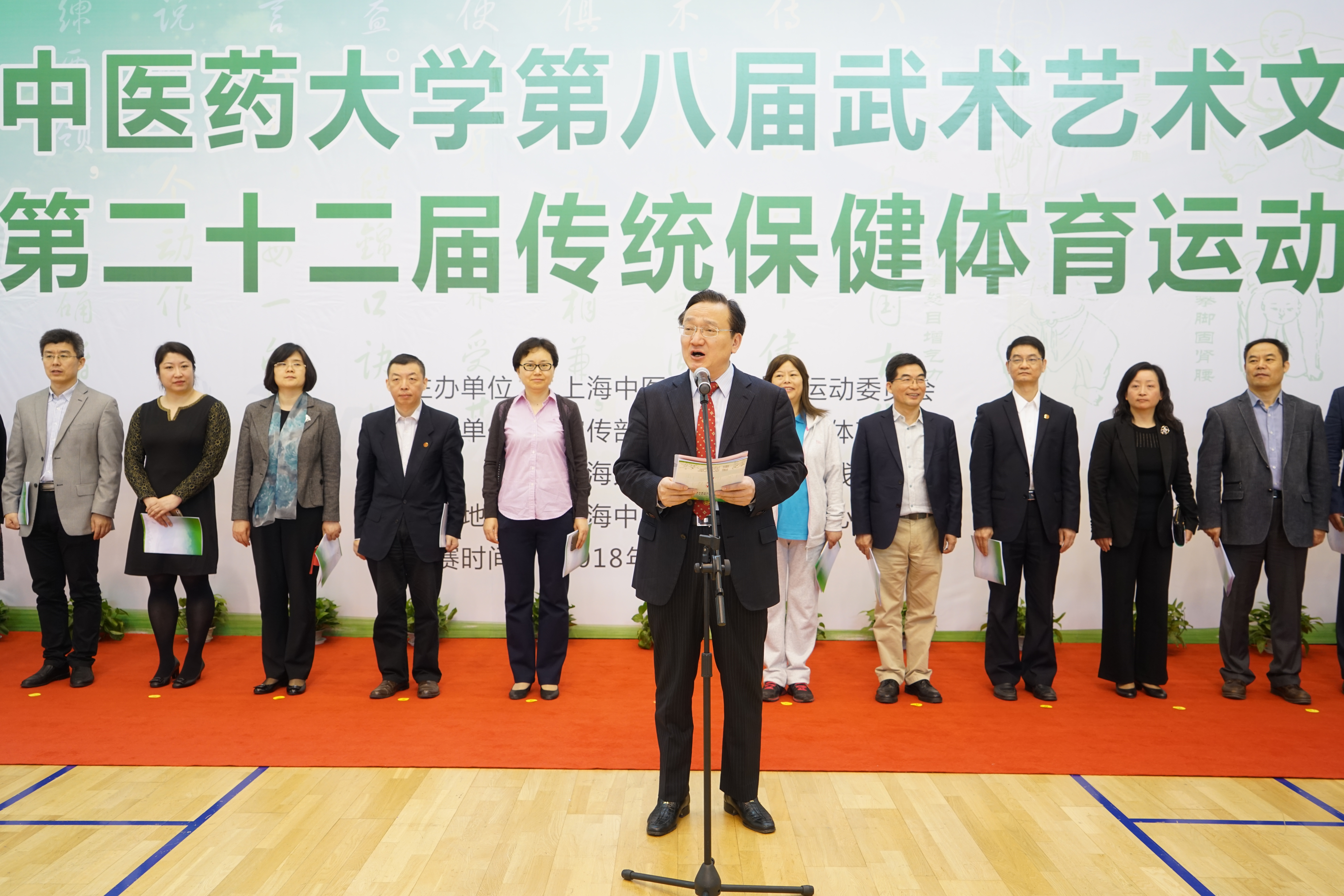 4月11日上午,我校第八届武术艺术文化节暨第二十二届传统保健体育运动会在体育馆正式拉开序幕。此次活动由我校体育运动委员会主办,宣传部、团委、工会、体育部联合承办,由本专科生、研究生、留学生代表组成的32支队伍参赛。我校校长徐建光,校党委副书记、副校长朱惠蓉,校党委副书记张艳萍,副校长陈红专、胡鸿毅、杨永清,校总会计师徐瑶玲以及各二级学院、部分职能部门负责人等出席开幕式。