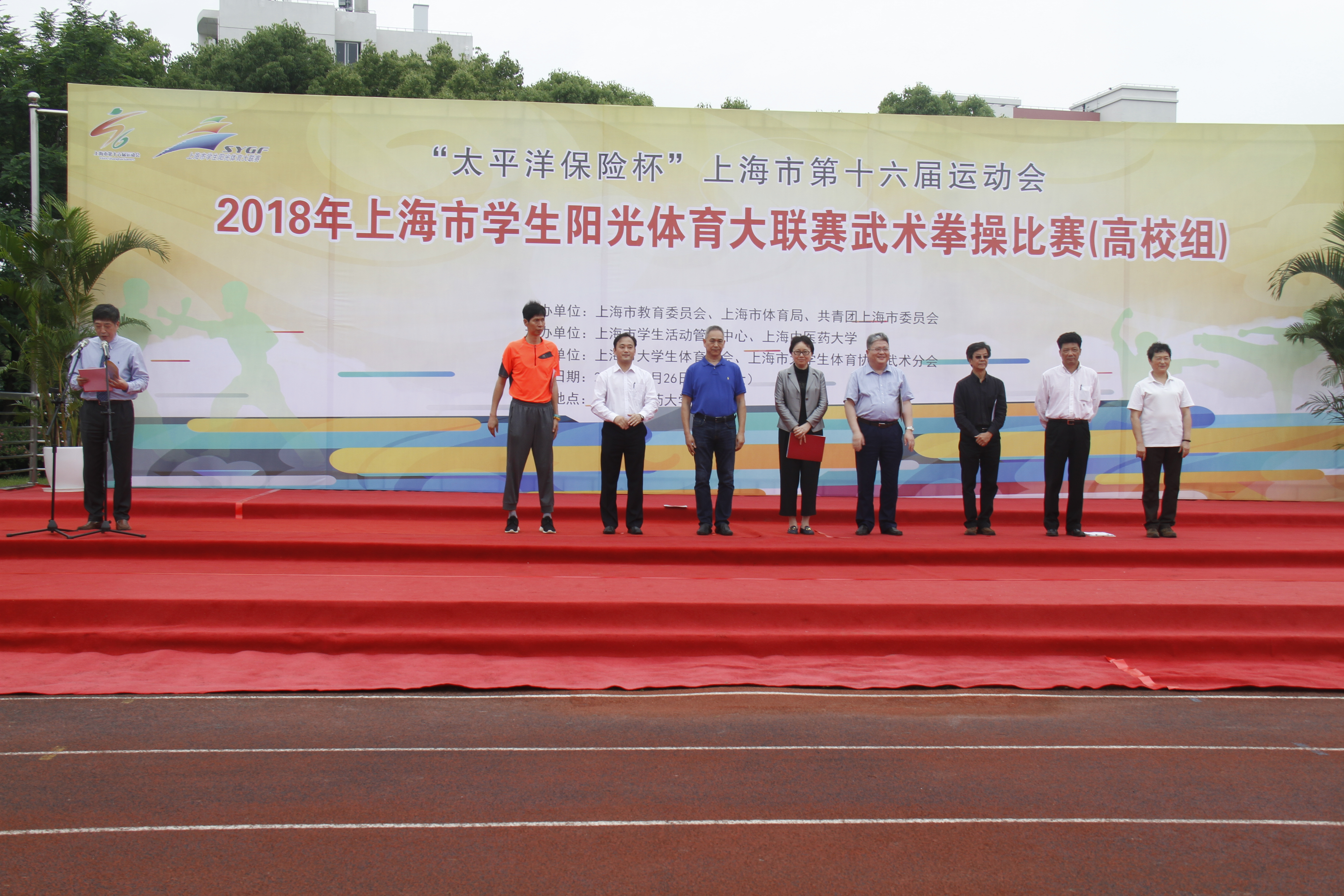 2018年5月26日上午,来自全市11所高校的近500名申城学子汇聚我校,参加2018年上海市学生阳光体育大联赛武术拳操比赛。我校党委副书记张艳萍、上海市学生活动管理中心副主任田磊、中国大学生体育协会民族传统体育分会副主席瞿良荣等出席开幕式并致辞。