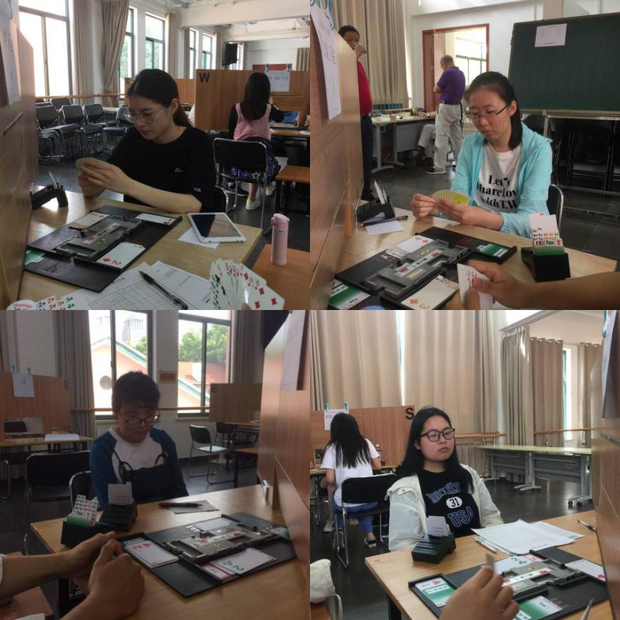 5月25、26日的团体赛中,我校上场了四位桥牌女队队员,其中的一对搭档曾在此前的上海市第十六届运动会桥牌双人赛中取得过第二名的佳绩,而另一对搭档则是初出茅庐的新人。“巾帼不让须眉”,我校队员在牌技上超越了海军军医大学队、上海工大学队,甚至还以微弱优势战胜了同济大学队。牌桌上的她们专心致志,遵守桥牌礼仪,充分体现了桥牌中的绅士之风,如明手摆牌时一定要把牌按照大牌在上、小牌在下排好后,正对庄家摆放;又如做庄家时一定要向同伴道谢,这也正如桥牌普及推广大使的万嗣铨所说,“这是规矩,也是对队友的尊重”。双人赛于26日上午举行,参加比赛的两名队员发挥稳定,获得了第八名的好成绩。