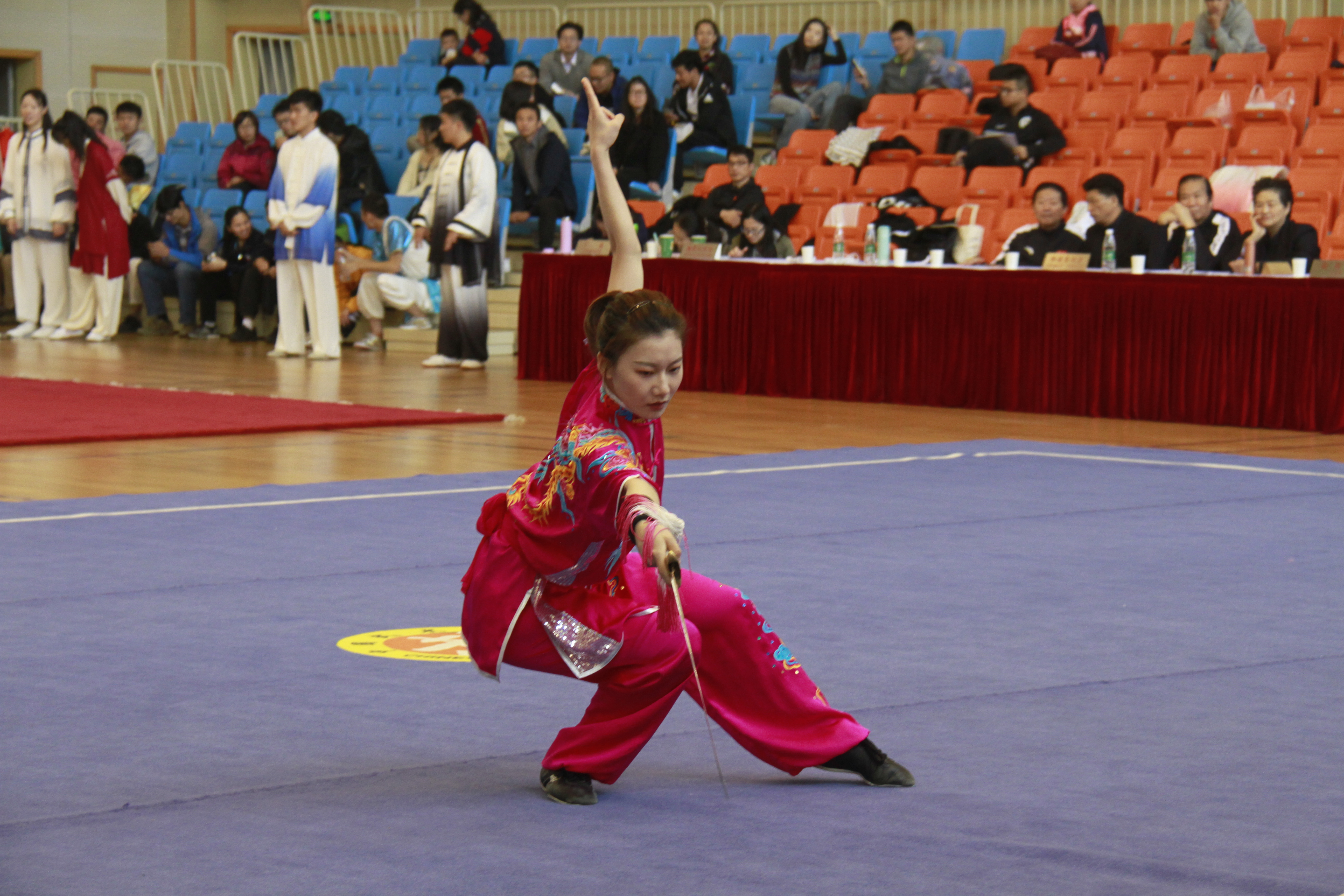 本次比赛旨在为上海高校大学生提供交流学习、切磋技艺、增进友谊的平台,以武术来推动高校阳光体育运动的开展,引导学生积极传承中华优秀传统文化,汲取中国智慧,树立健康向上的审美观和价值观。比赛共设置甲乙两个组别,甲组为普通大学生,乙组为运动员。设有自选拳术、自选短器械、自选长器械、其他拳术、其他器械、24式太极拳、32式太极剑、龙身蛇形太极拳、咏春拳等比赛项目。比赛中,既有个人徒手或手持器械的演练,又有精彩的两人对练。其中,紧张、激烈的两人对练,最为引人关注。沪上大学生们所展现出的勇于拼搏的良好精神面貌以及优秀的意志品质给现场每一位观众留下了深刻印象。