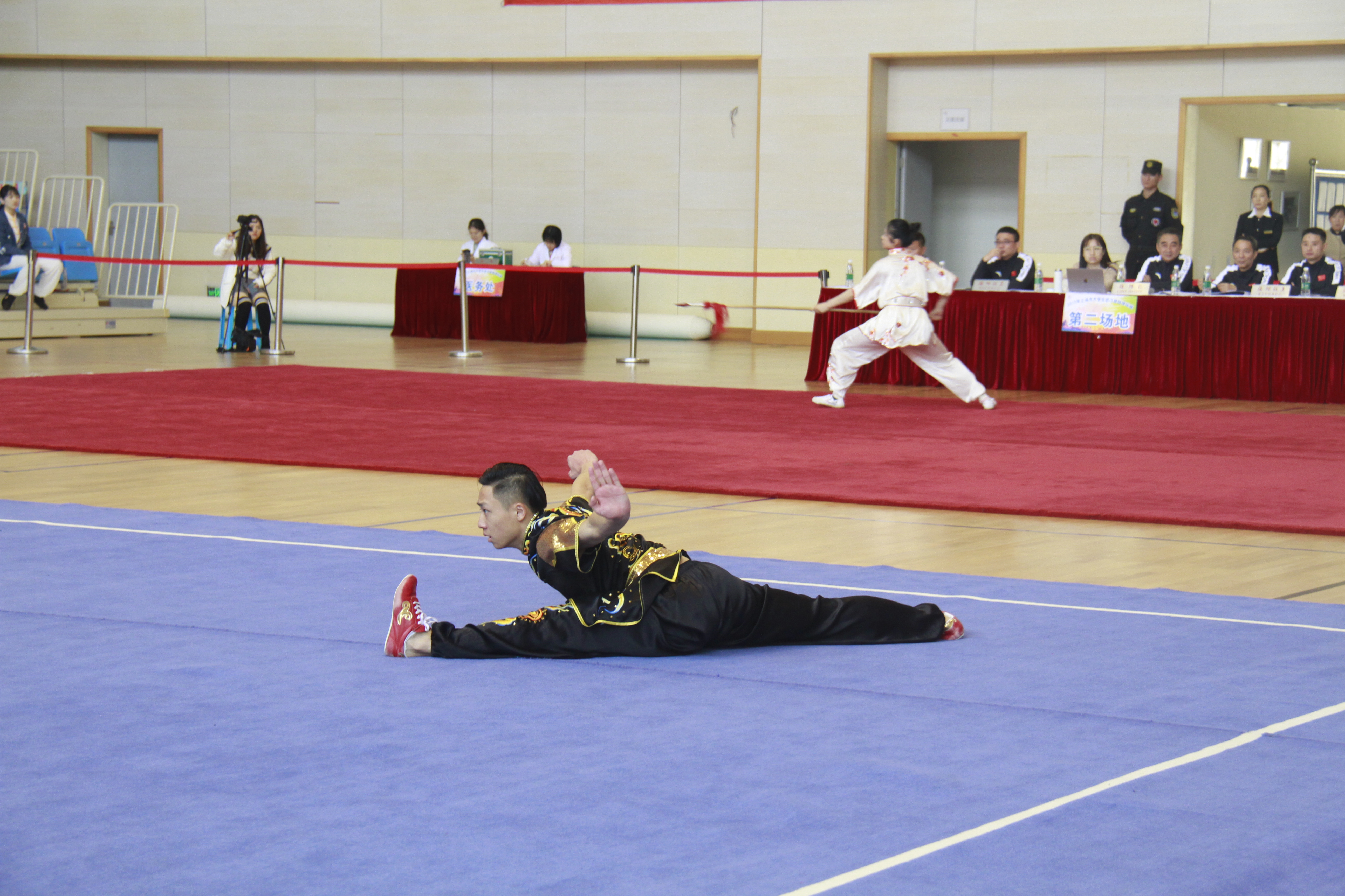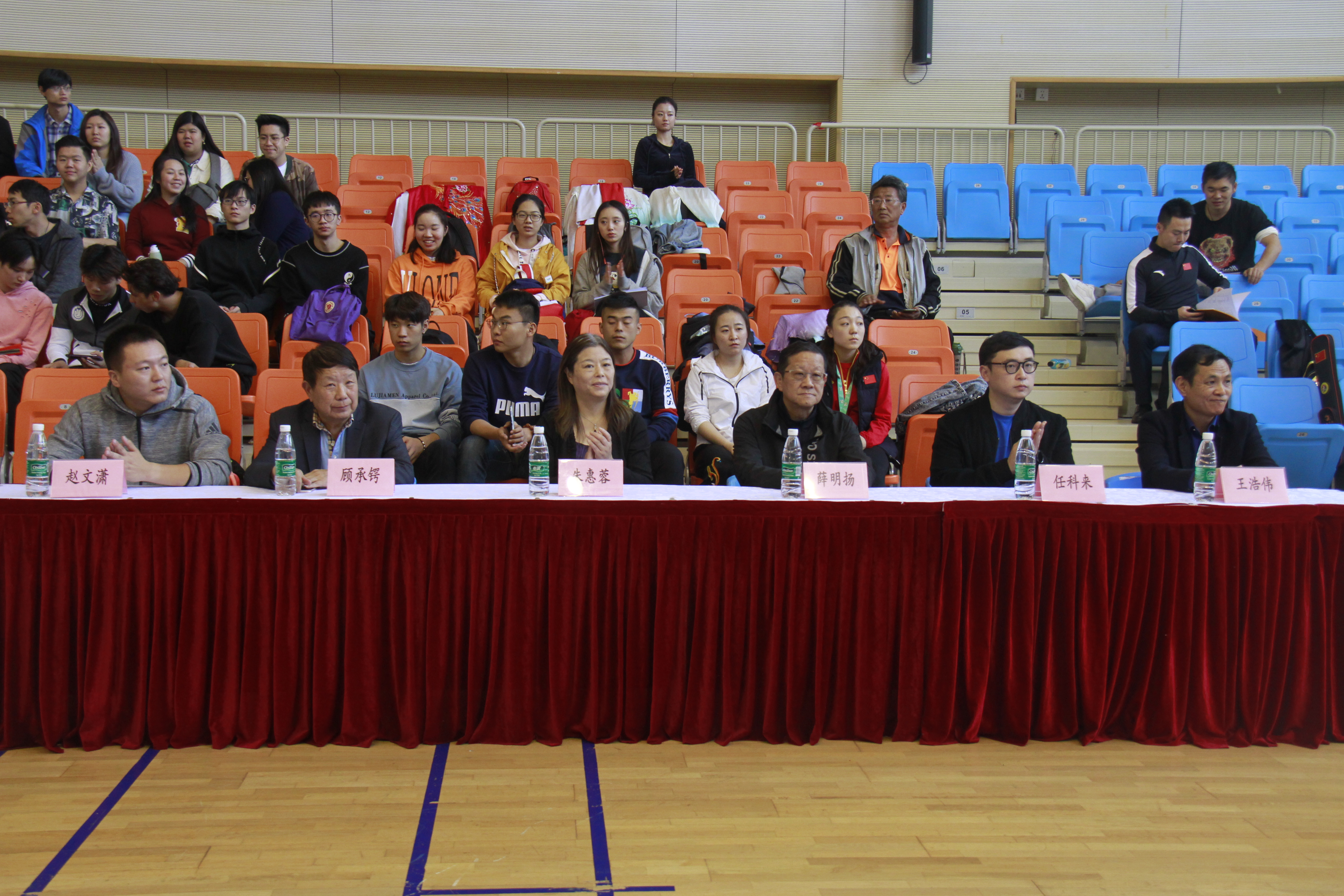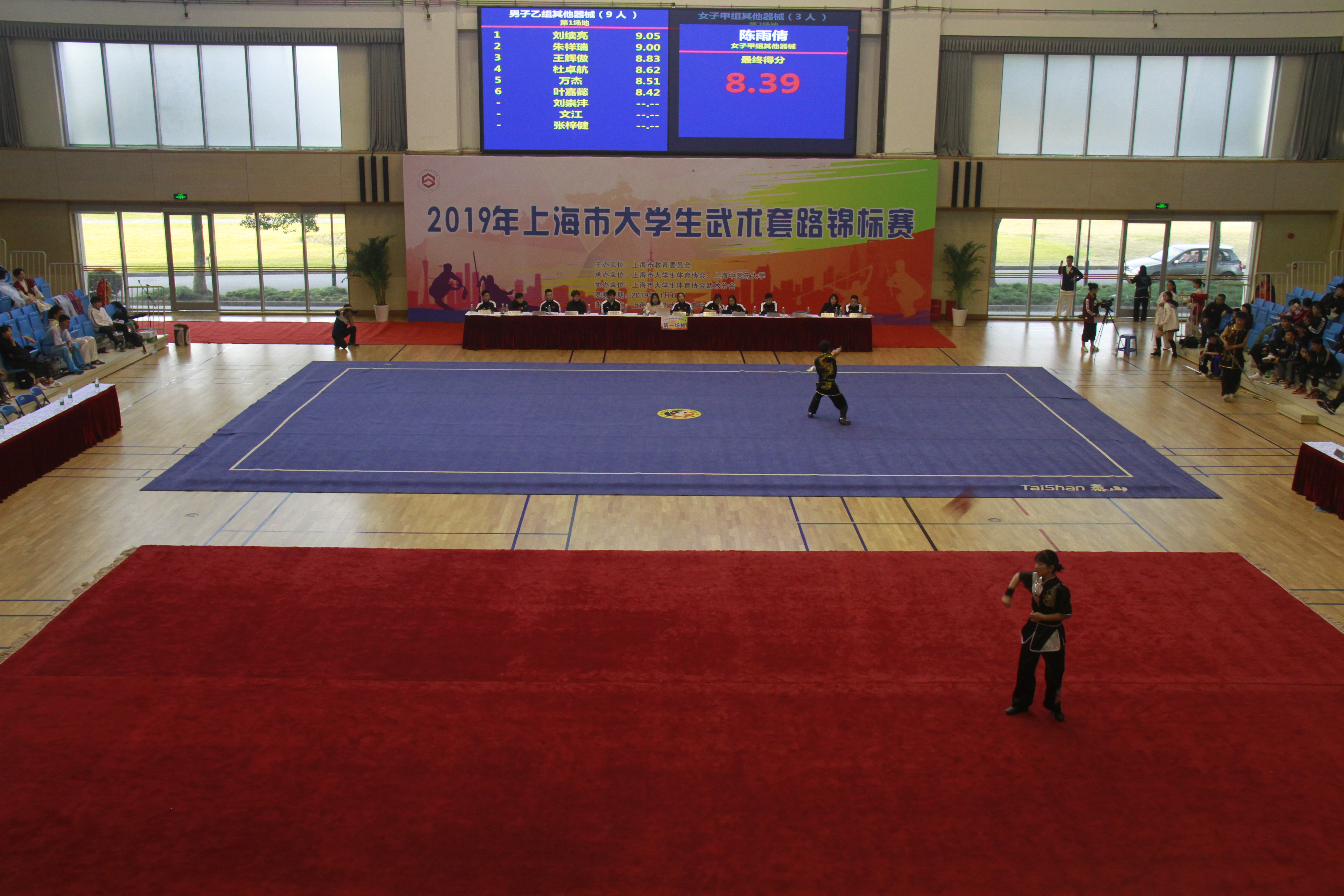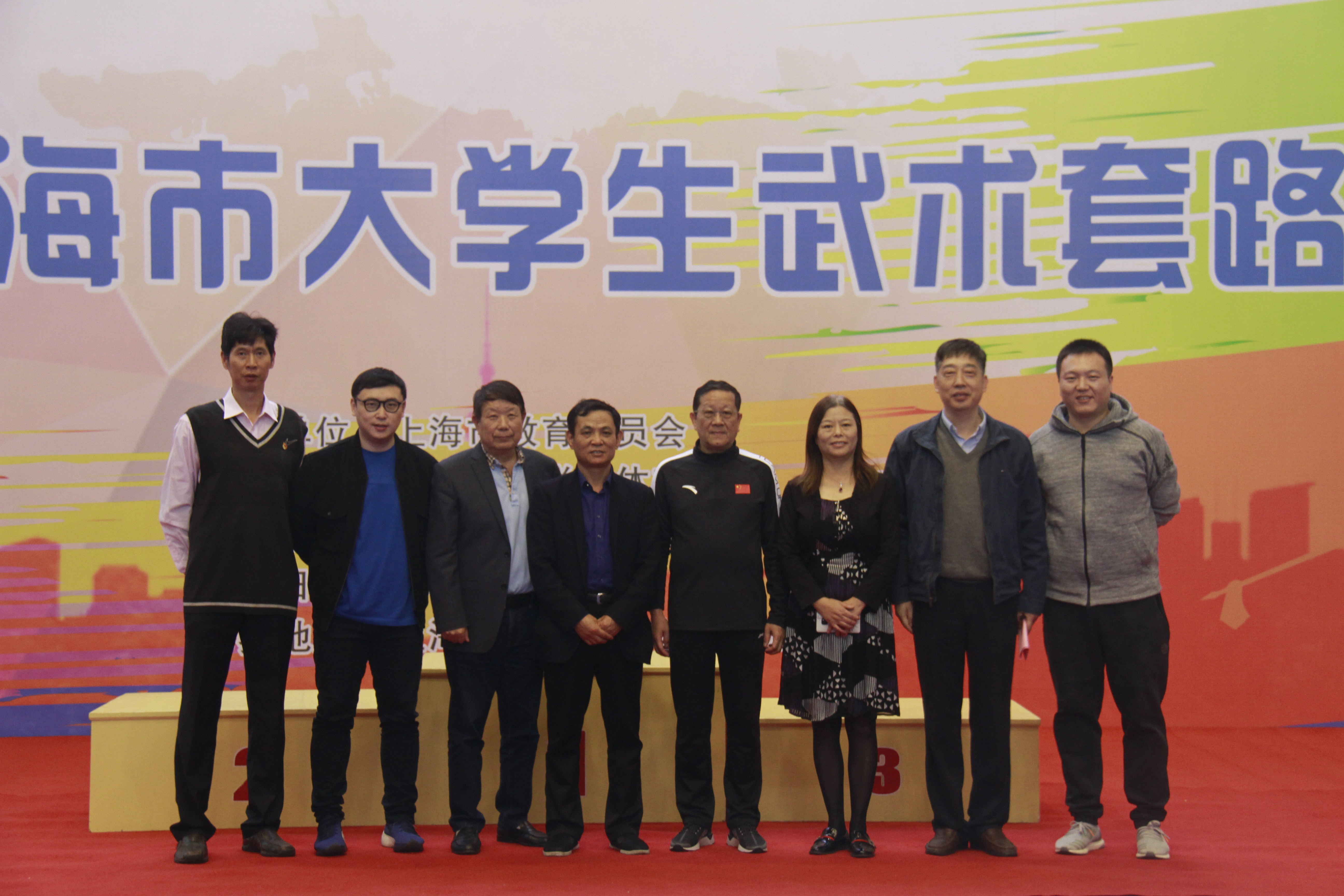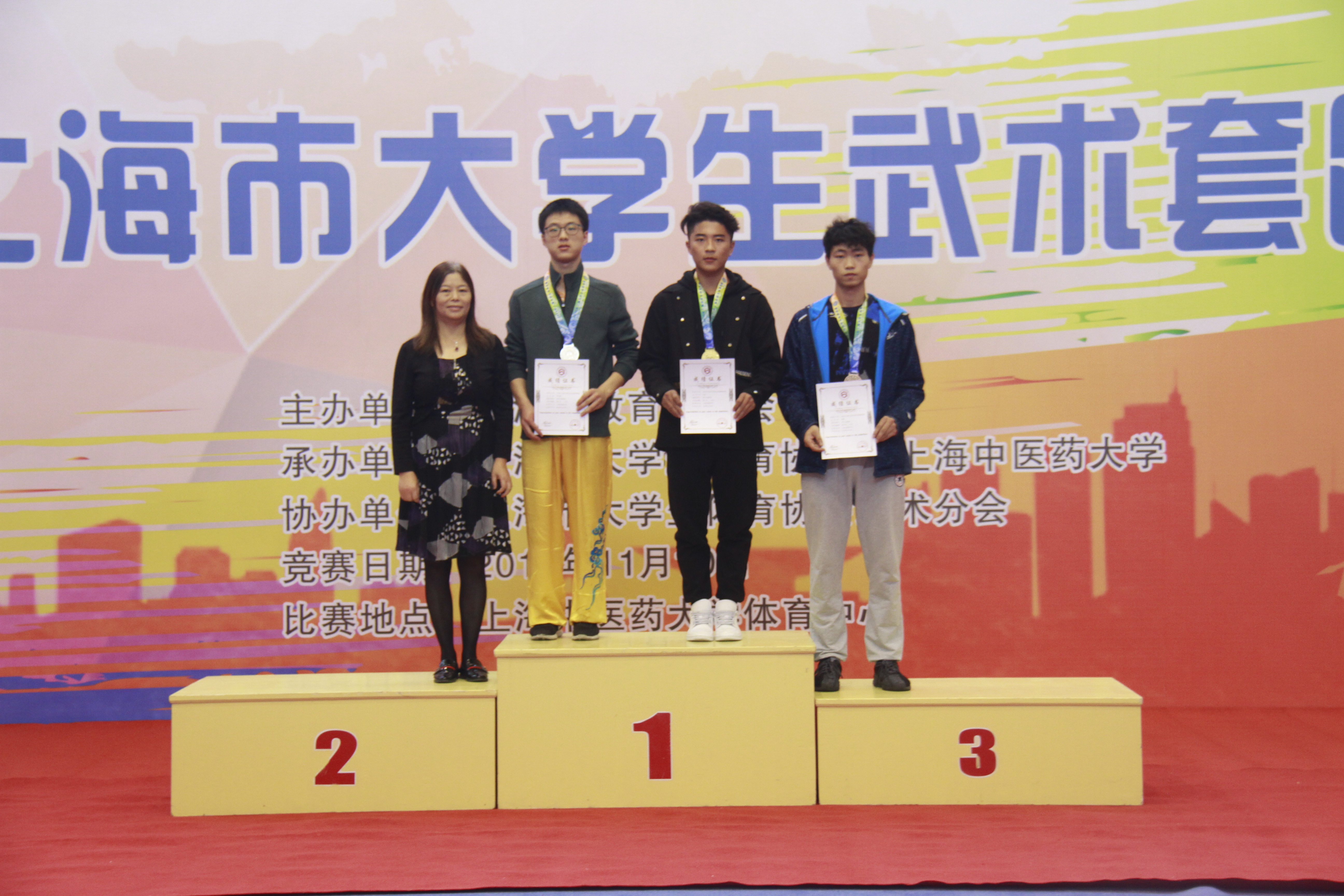 下午1:30点,比赛颁奖仪式正式开始,我校体育部主任吴志坤主持颁奖仪式,上海市大学生体育协会会长薛明扬、我校党委副书记副校长朱惠蓉、上海市大学生体育协会副秘书长任科来、上海市大学生体育协会副秘书长顾承锷、我校体育部党支部书记副主任龚博敏、上海交通大学教授、长江学者王浩伟等领导和嘉宾分别为获奖运动员颁奖。经过一天激烈的角逐,2019年上海市大学生武术套路锦标赛圆满落下帷幕,我校队员经过顽强拼搏,最终获得了10金3银3铜的好成绩。本次锦标赛为广大学生搭建了以武会友、展现武术竞技水平、实现自我价值的平台,有力推动了上海高校武术运动的蓬勃发展。