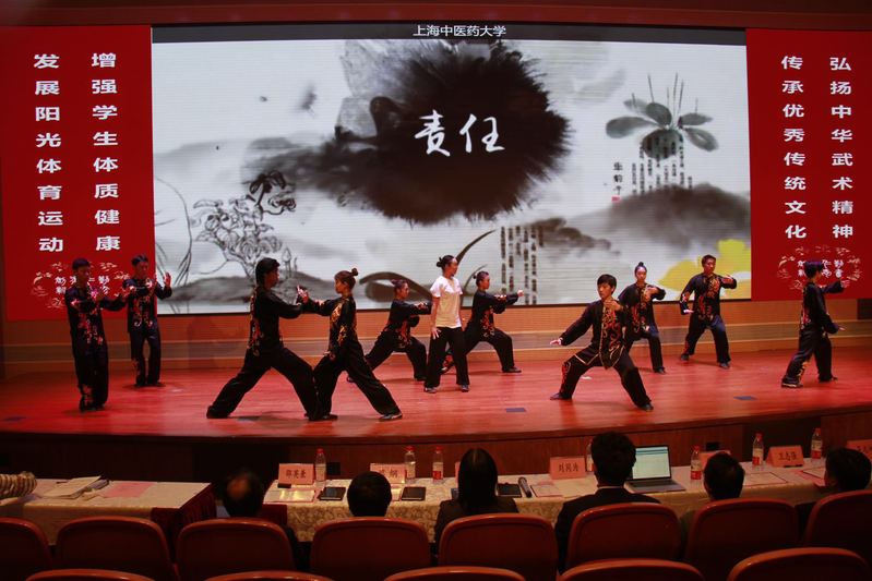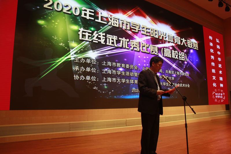 体育部主任吴志坤致开幕词,他指出,中华武术作为中国传统文化的一个重要组成部分,是中国传统文化的重要外在表现形式之一,也是中华优秀传统文化的重要载体。“武术秀”则是一种新型的竞赛形式,是武术与表演艺术的完美呈现,是武术艺术化的一种创新。通过不断创新,武术这种具有艺术韵味的身体文化也得以持续散发它独特的魅力!今年由于疫情影响,武术秀比赛从线下走上线上,希望可以借此鼓励申城学子通过用武术的方式强身健体,增强免疫力,也希望能利用在线直播这一同学们喜欢的传播方式,让更多年轻人了解中国武术的文化与魅力,从而以武健体、养育身心!