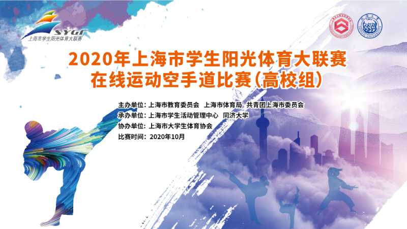 10月31日,2020年上海市学生阳光体育大联赛在线运动空手道比赛(高校组)在同济大学新体育馆火热举行。此次赛事由上海市教育委员会、上海市体育局、共青团上海市委员会主办,上海市学生活动管理中心、同济大学承办,上海市大学生体育协会协办。比赛分为个人型,男子、女子团体型及男女混合集体型,可展示空手道各流派的平安型,来自沪上17所高校的178名运动员线上直播参赛,展示个人及团队的风采。