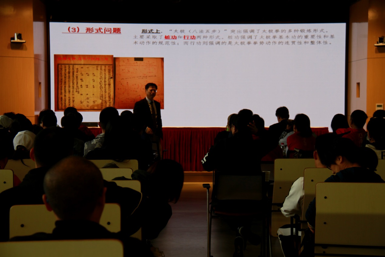 11月7日下午进行了太极《八法五步》、五禽戏的技术讲解,五禽戏培训由体育部教师,武术套路国家级裁判、副教授冯金瑞老师授课,冯教授以五禽戏的中医理论基础、五禽戏的健身功效、五禽戏的习练要点进行了详细的讲解,受到一致好评。